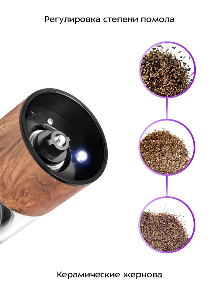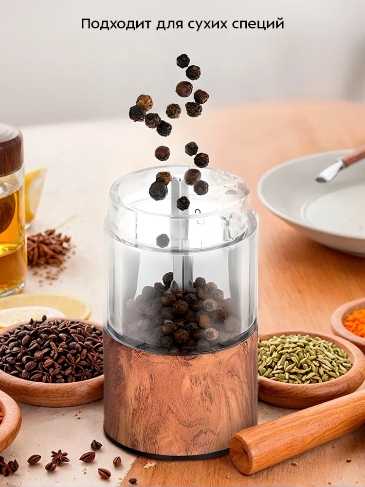 Автоматическая мельница имеет простое управление одной кнопкой. Поместите устройство над блюдом и нажмите на кнопку, чтобы быстро смолоть специи, не прикладывая никаких усилий.