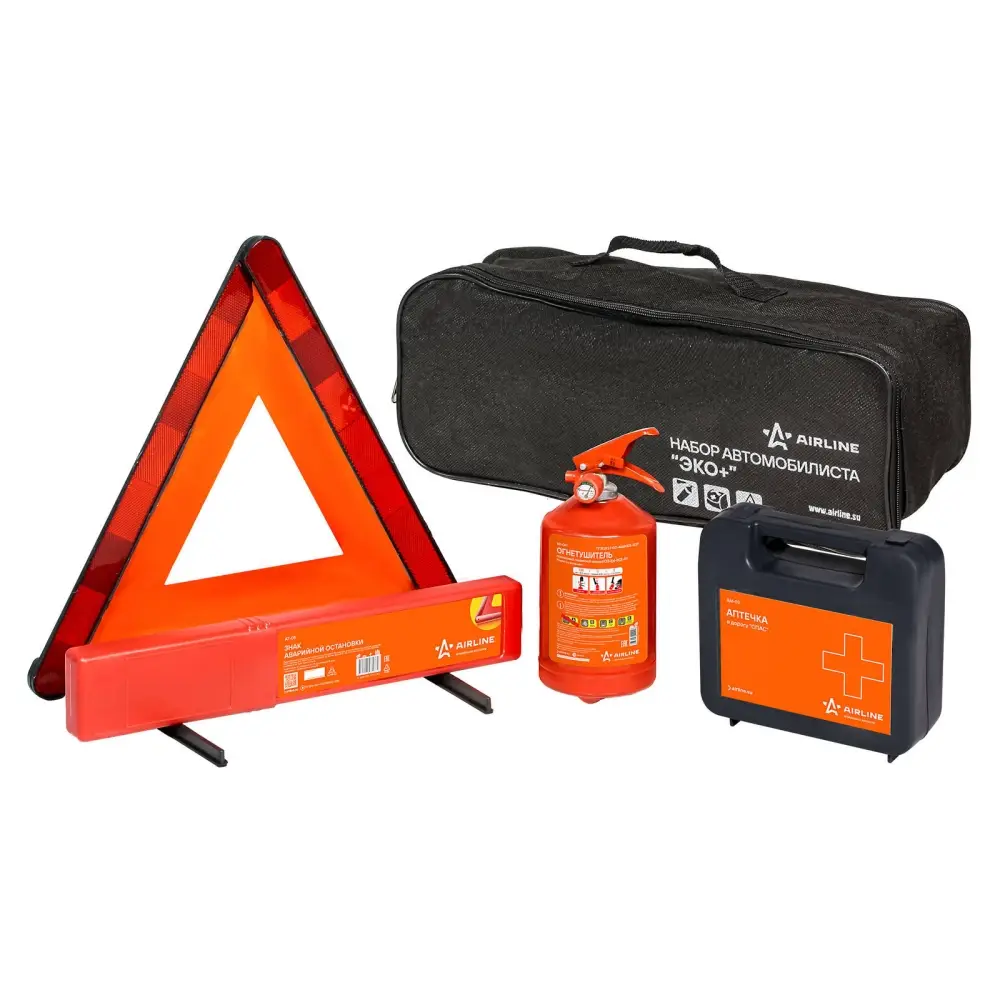 Автомобильный набор серии ЭКО+ оснащен базовой комплектацией необходимых каждому автомобилисту принадлежностей. В комплект включены средства первой необходимости, среди которых: знак, обозначающий экстренную остановку, огнетушитель ОП1, а также аптечка с превязочным материалом для оказания первой медицинской помощи.