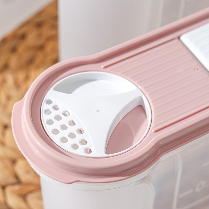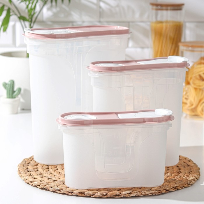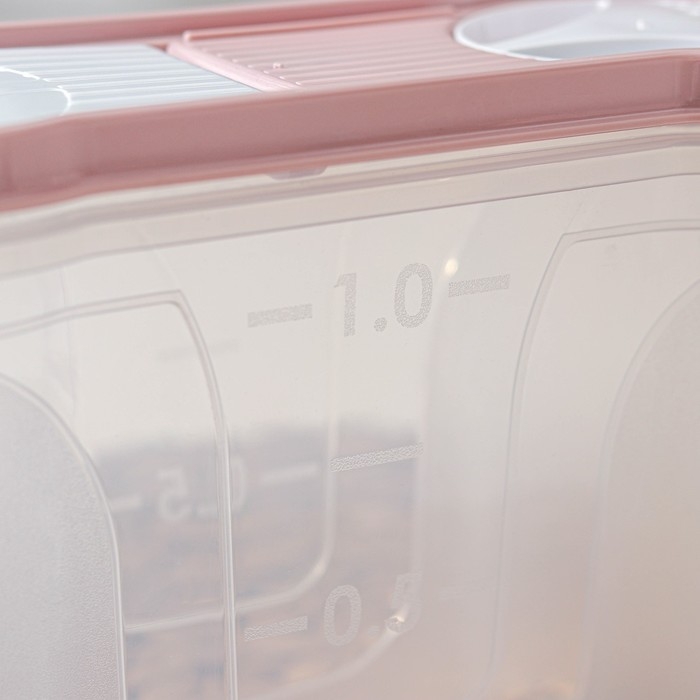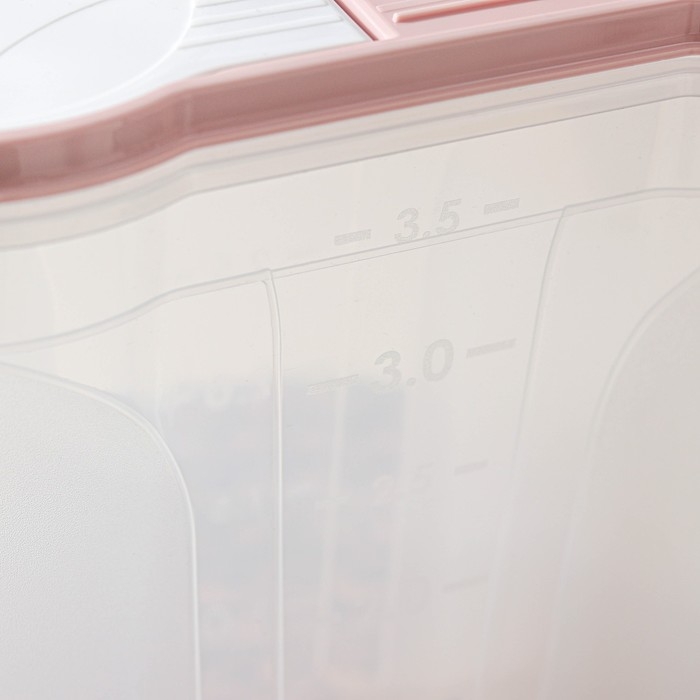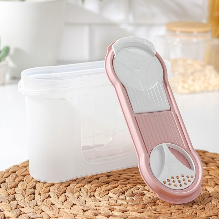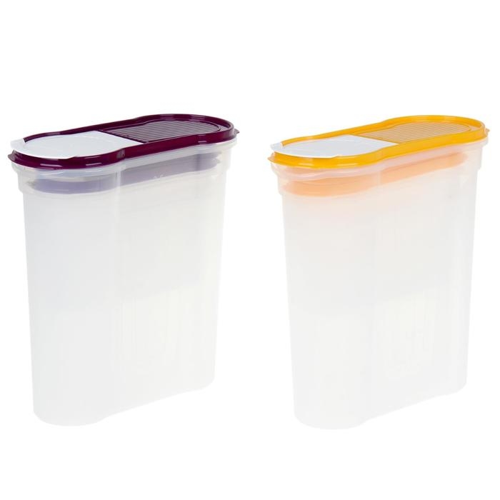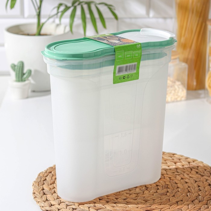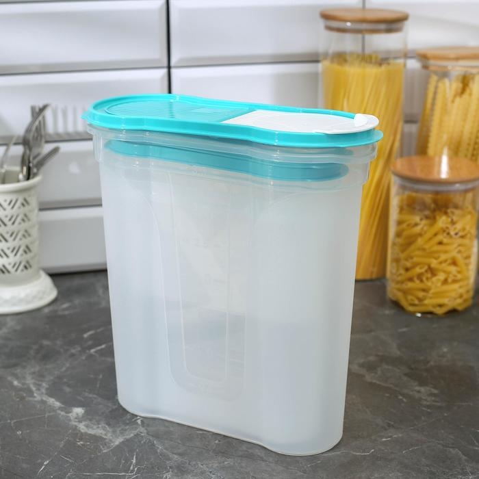 Банка для сыпучих продуктов изготовлена из пластика. Имеет плотно закрывающуюся крышку, которая защищает еду от влаги и посторонних запахов. В ёмкости удобно хранить крупы, специи, макаронные изделия, сахар, муку и бобовые.