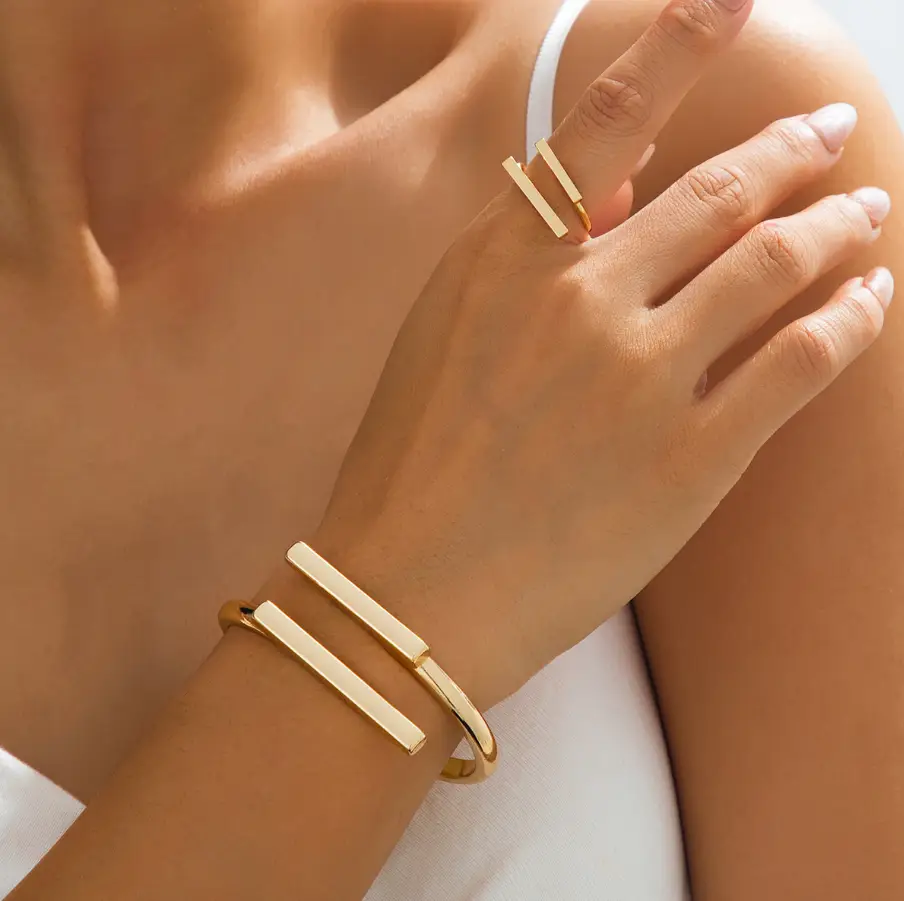 Браслет обладает утончённым дизайном с изящными деталями, которые придают ему особую привлекательность. Он прекрасно облегает запястье, добавляя нотку шика к любому образу — от повседневного до вечернего. Кольцо гармонично дополняет браслет, его гладкая поверхность и аккуратные линии создают эффектный акцент на пальце.