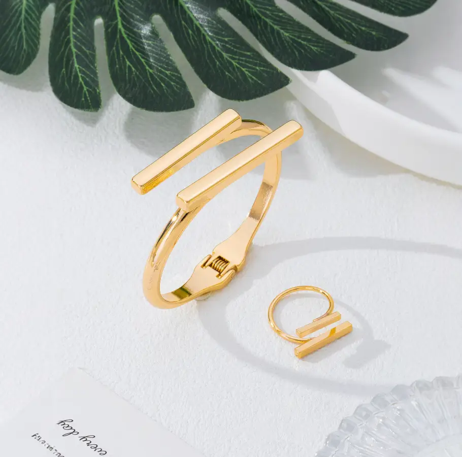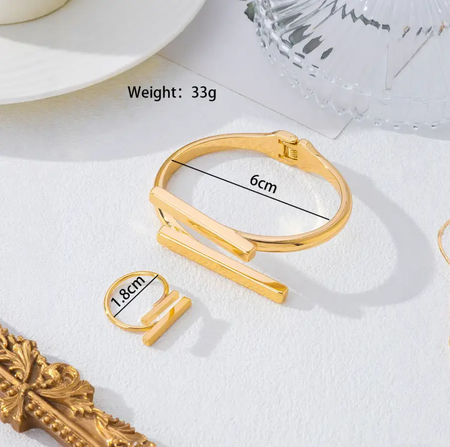 Представляем вашему вниманию изысканный набор бижутерии, состоящий из стильного браслета и элегантного кольца, выполненных в роскошном золотистом цвете.