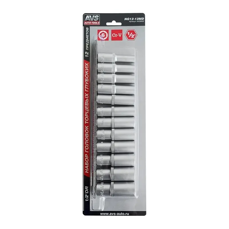 Набор головок торцевых 1/2"DR (10-24 мм) (12 предметов) глубокие на держателе AVS NG12-12MD