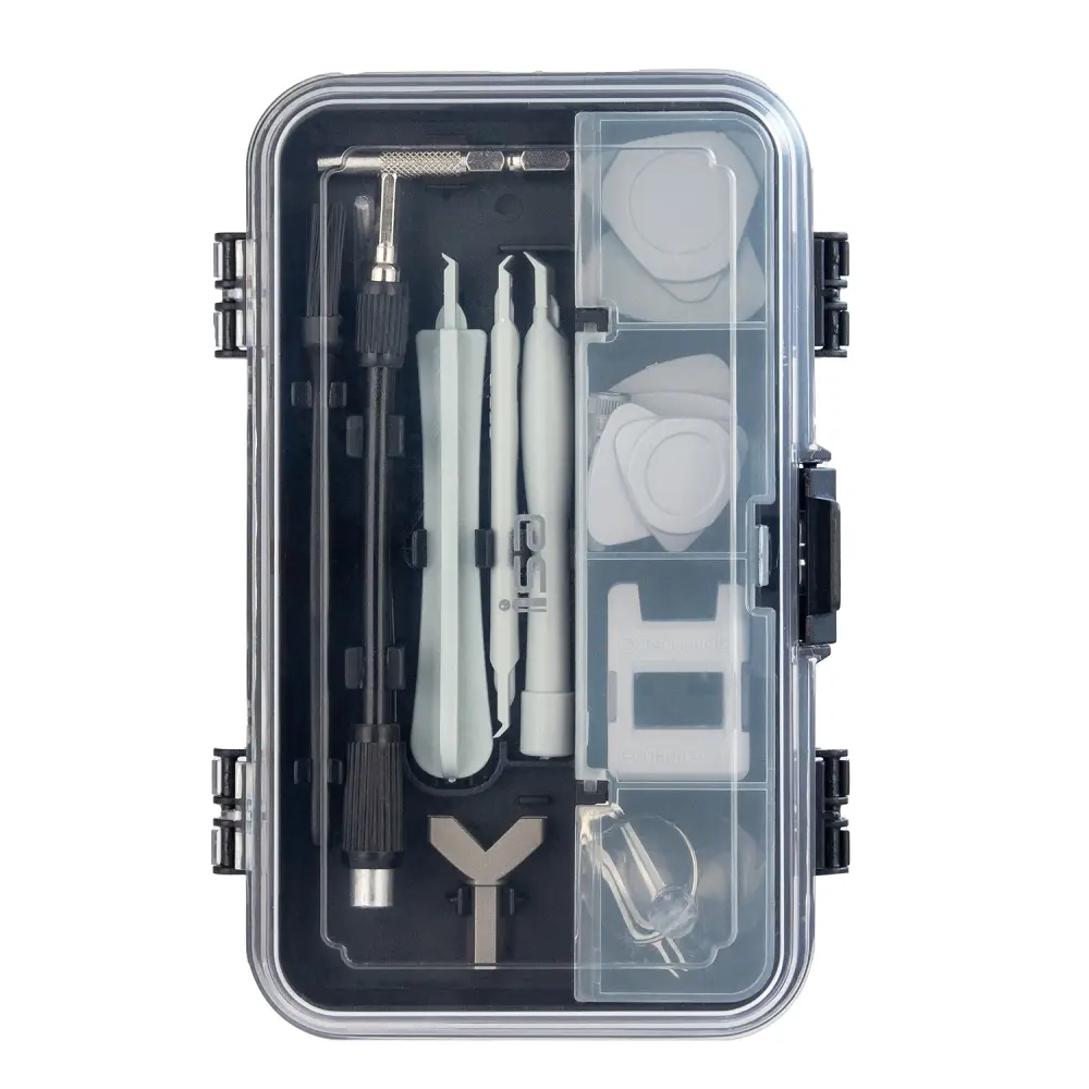 В набор входит 118 высокоточных бит. 21 предмет для монтажа: Ручка отвертки - 1 шт; Гибкий удлинительный вал - 1 шт; Удлинитель - 1 шт; Пинцет - 1 шт; Пластиковые инструменты для монтажа - 3 шт; Скрепка для извлечения сим - карты - 2 шт; Намагничиватель/размагничиватель - 1 шт; Присоска - 1 шт; Держатель для бит - 1 шт; Отмычка - 6 шт; Крюковой привод - 1 шт; Винтовой коврик с памятью - 1 шт; Щетка - 1 шт. Твердость материала - 60 HRC. Антикоррозийное покрытие - да. Материал корпуса бит - металл. Вес товара