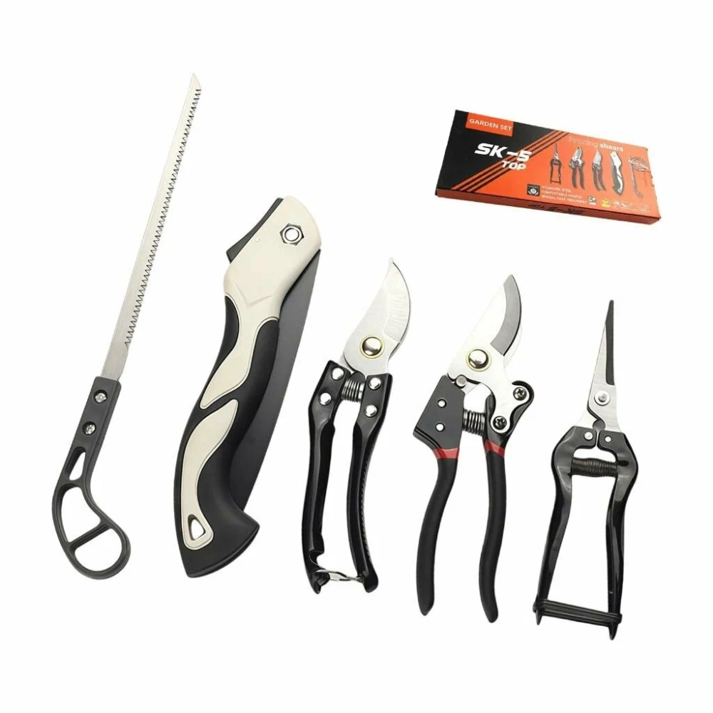 Универсальный садовый набор из 5 предметов: включает в себя необходимые инструменты, такие как лопата, садовый инструмент и секатор, для решения различных задач в саду, заменяя необходимость использования отдельных инструментов в жилых садах и общественных зеленых зонах.