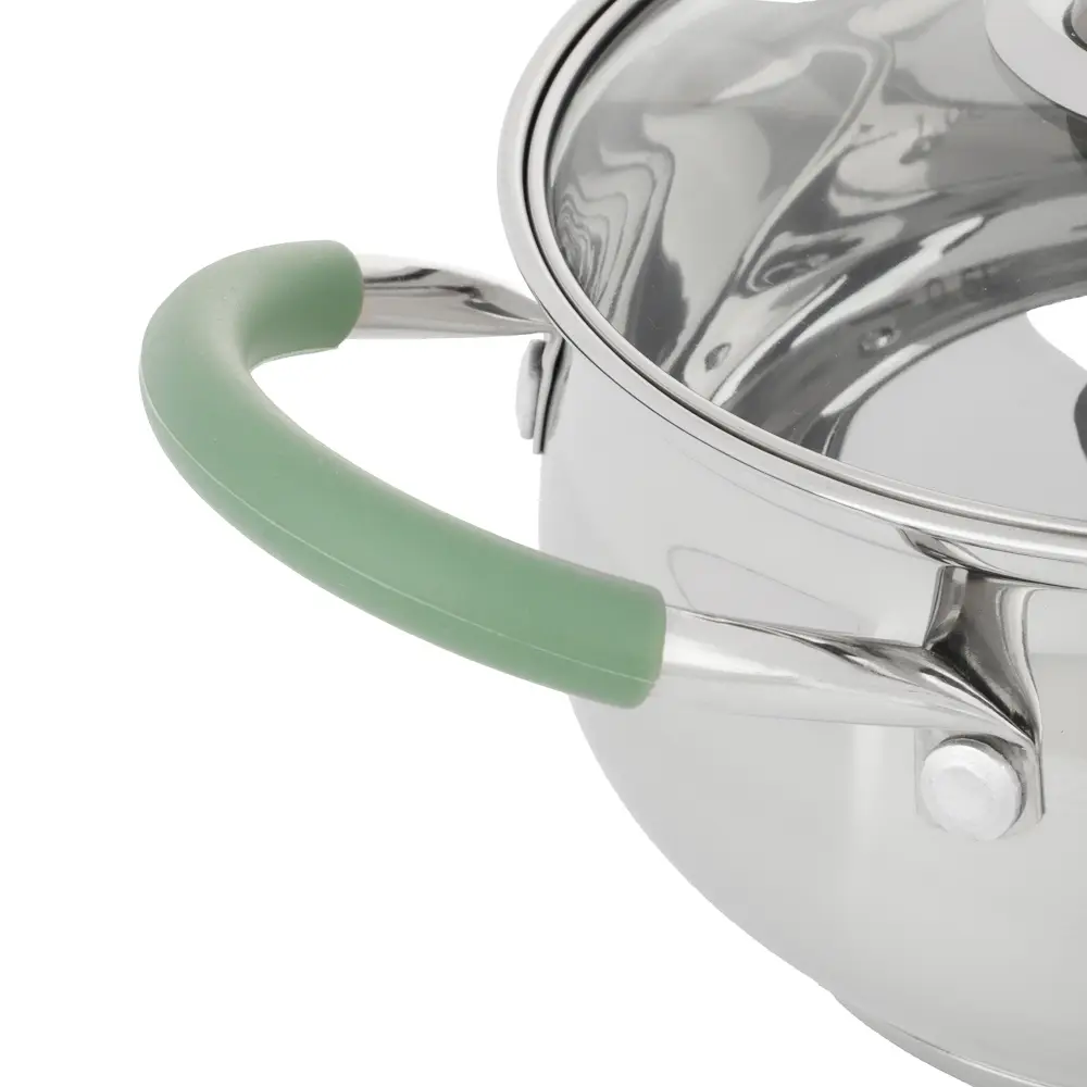 Кастрюли оснащены силиконовыми ручками, которые не нагреваются и не плавятся даже при длительном приготовлении. Крышки из термостойкого стекла позволяют контролировать процесс готовки без потери тепла и аромата.