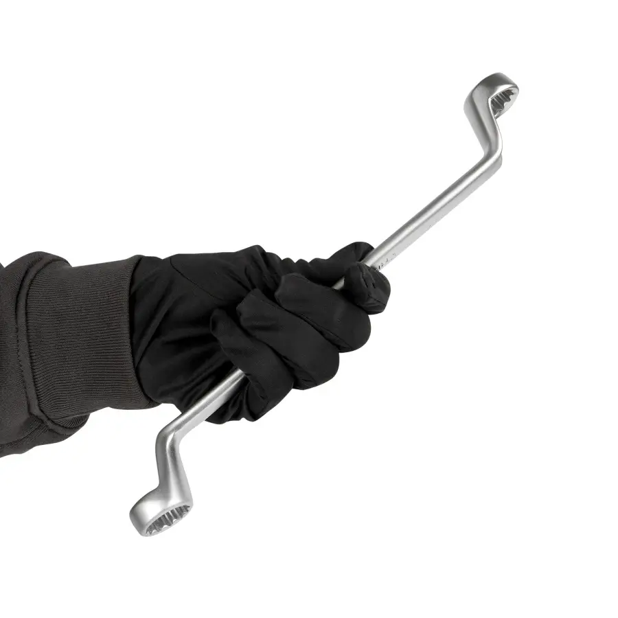 Накидной ключ – это рукоять и зажимная часть, которая охватывает весь периметр гайки. Он более удобен в эксплуатации и надежнее фиксирует крепеж, чем рожковый. Применяется для работ с высоконагруженными резьбовыми соединениями. Изогнутая на 75° коленчатая рабочая часть облегчает доступ в труднодоступные места. Кольцевые ключи имеют 12 граней. 12-тигранный ключ более распространен в использовании (поворот на 30 градусов). Из-за большого пятна контакта вероятность деформации углов сведена к нулю. Ключи изготавливаются из легированной хромованадиевой стали по стандарту DIN 838, в соответствии с ГОСТ 2906-80.