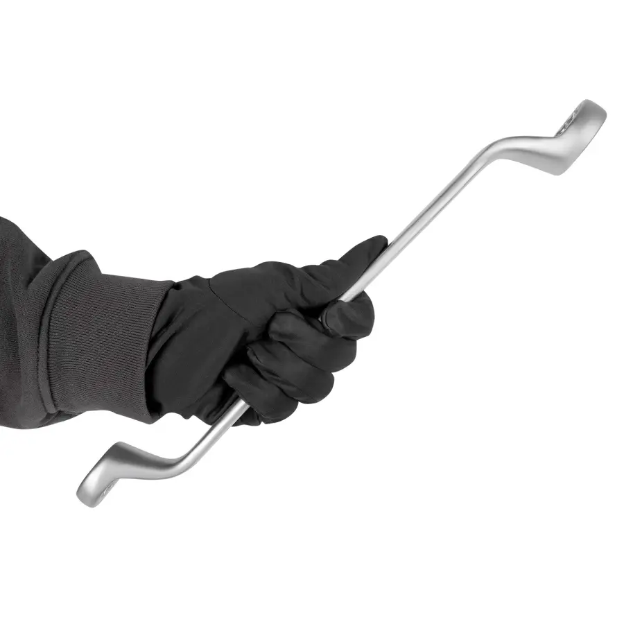 Накидной ключ – это рукоять и зажимная часть, которая охватывает весь периметр гайки. Он более удобен в эксплуатации и надежнее фиксирует крепеж, чем рожковый. Применяется для работ с высоконагруженными резьбовыми соединениями. Изогнутая на 75° коленчатая рабочая часть облегчает доступ в труднодоступные места. Кольцевые ключи имеют 12 граней. 12-тигранный ключ более распространен в использовании (поворот на 30 градусов). Из-за большого пятна контакта вероятность деформации углов сведена к нулю. Ключи изготавливаются из легированной хромованадиевой стали по стандарту DIN 838, в соответствии с ГОСТ 2906-80.