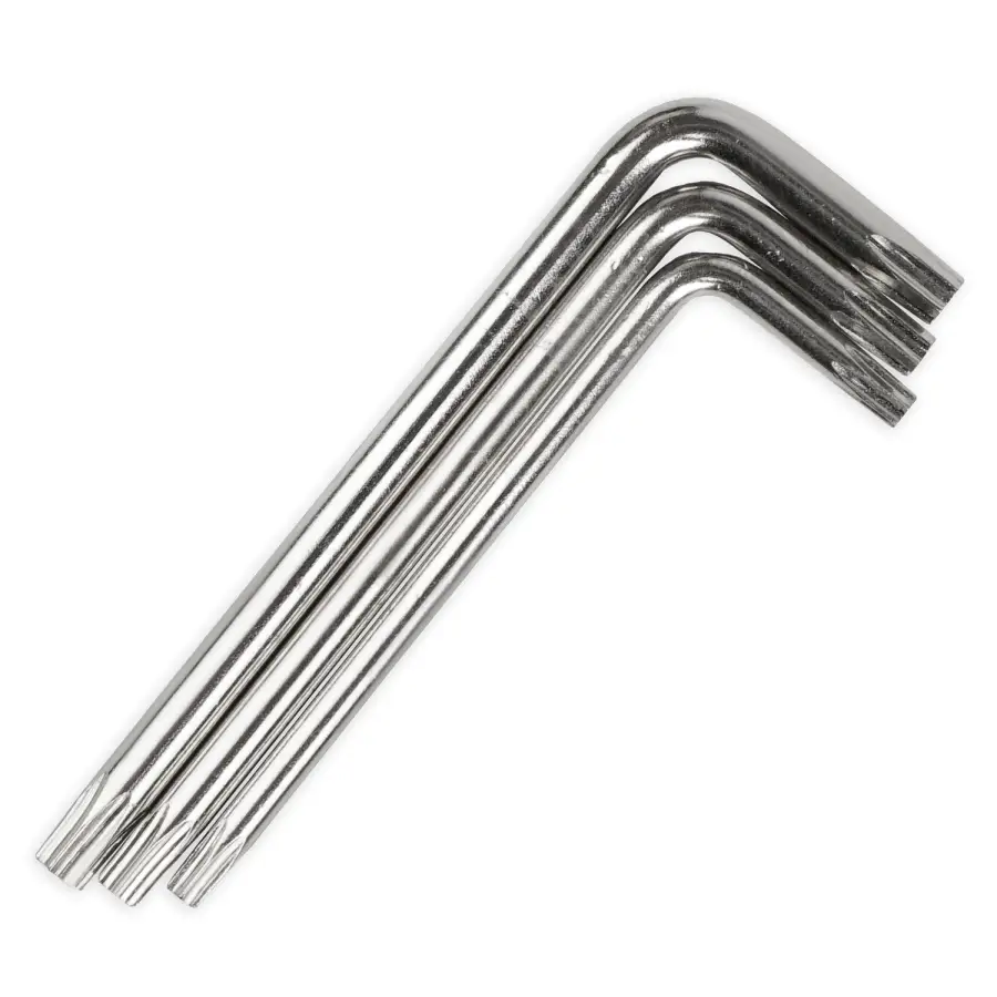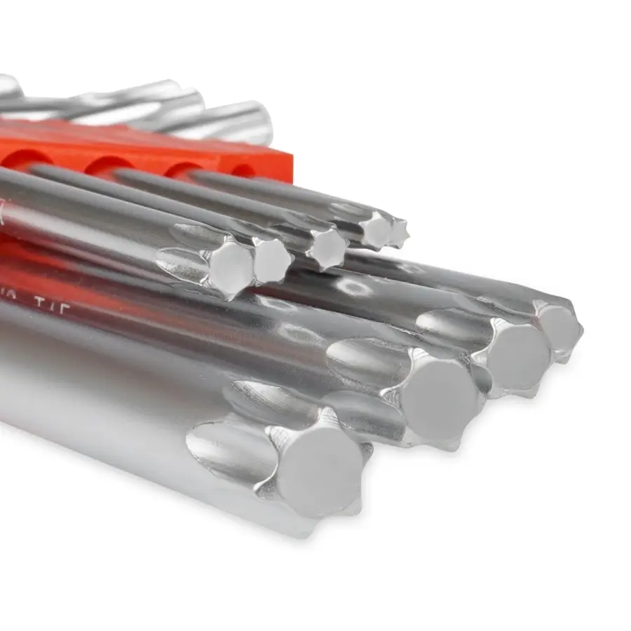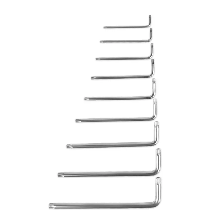 Набор состоит из 9-ти Г-образных ключей TORX, в пластиковом держателе. Предназначен для работы с соединениями с шлицем TORX.