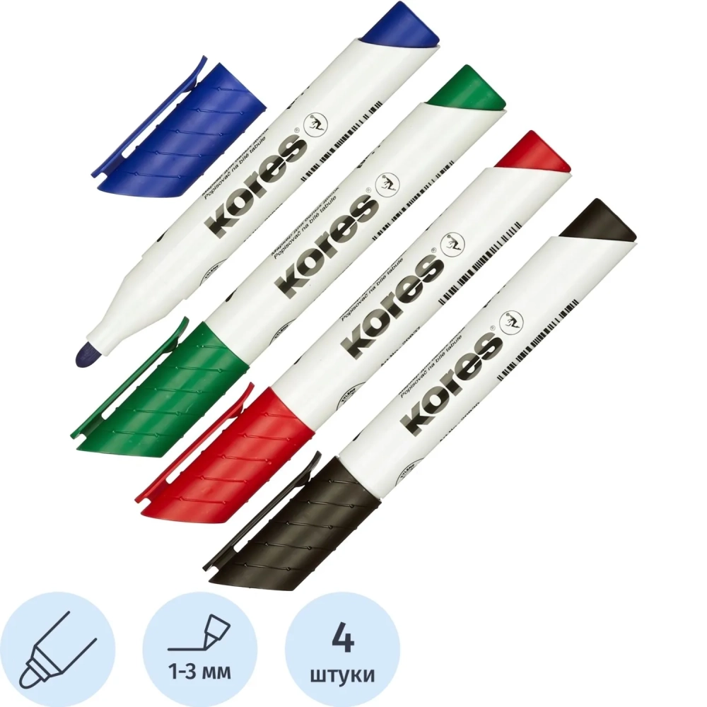 Набор маркеров для белых досок KORES с губкой 3мм 4шт/уп 20863