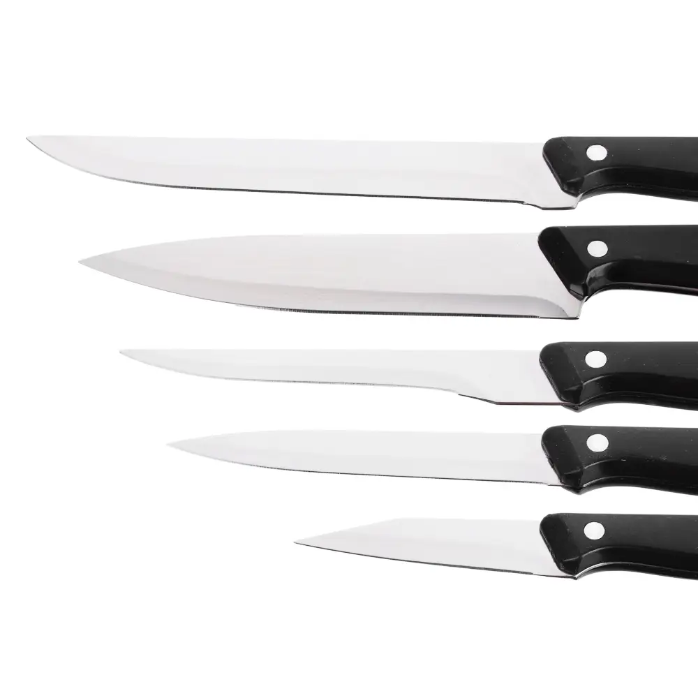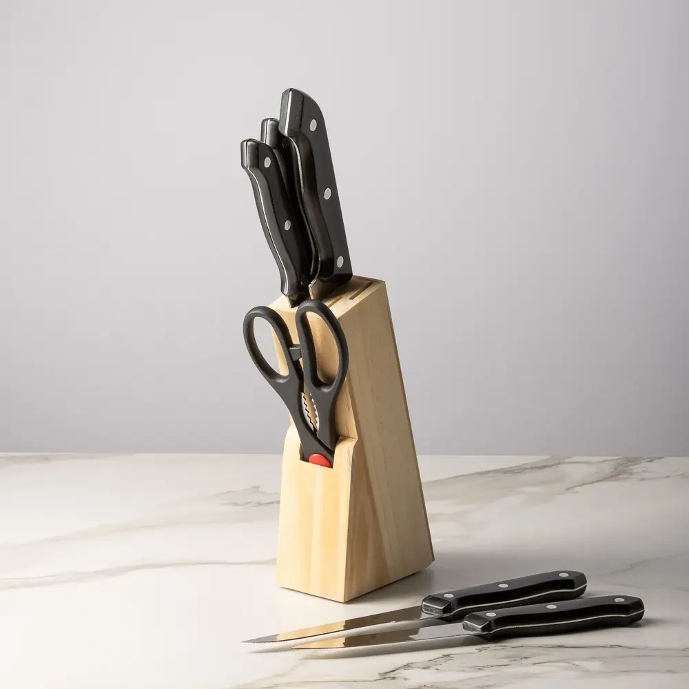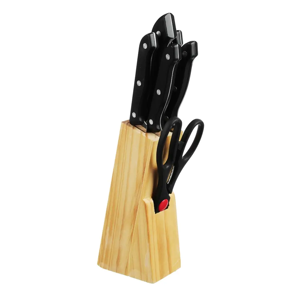 Набор из 6 предметов в деревянной подставке - идеальный выбор для любой кухни! В комплект входят ножи различных размеров: 8,5 см, 12,5 см, 14 см, 19 см, а также ножницы. Лезвия из нержавеющей стали имеют острую заводскую заточку, не подвержены коррозии. Эргономичные ручки гарантируют удобный и безопасный захват во время работы. Набор станет отличным дополнением к любой кухне и позволит вам с легкостью решать различные кулинарные задачи - от нарезки овощей до разделки мяса. Деревянная подставка не только обеспечивает удобное хранение ножей, но и придает набору стильный и элегантный вид. Обновите свою коллекцию кухонных инструментов уже сегодня!