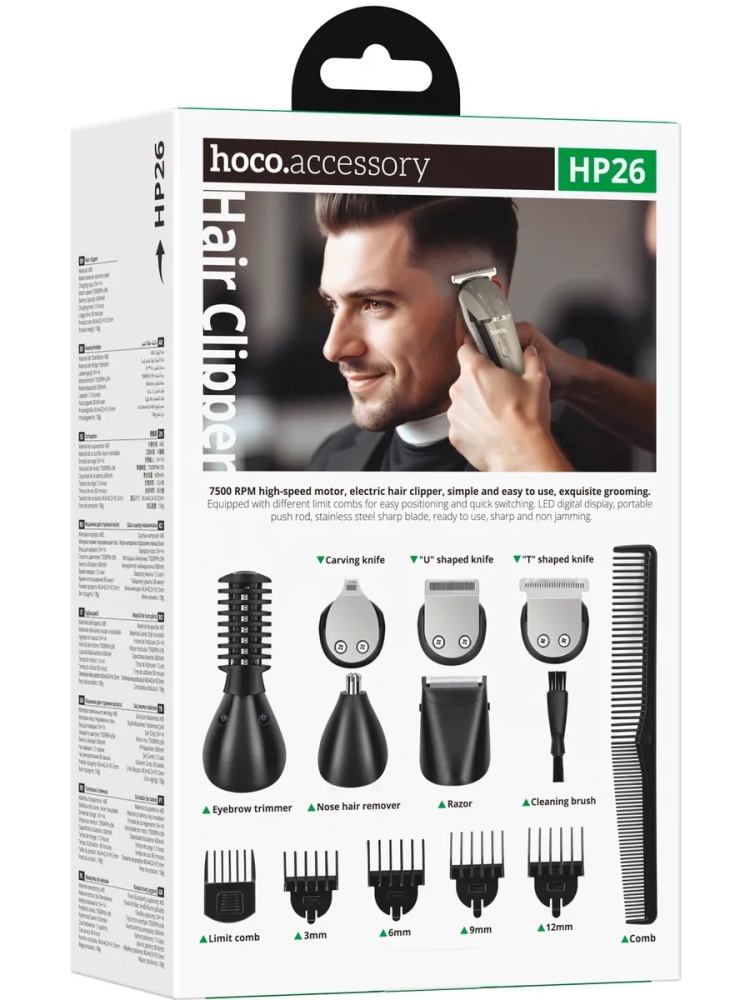 Набор для стрижки и бритья Hoco HP26 — это многофункциональный комплект, который подходит для профессионального и домашнего использования. Он позволяет выполнять стрижки, подравнивание, удаление волос в носу и ушах, моделирование бровей.