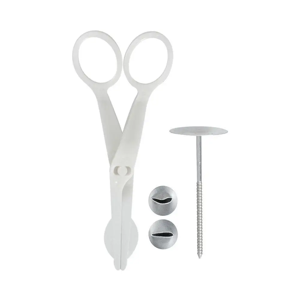 Изготовлено: насадки и кондитерский гвоздь из коррозионностойкой (нержавеющей) стали, ножницы из пластмассы (ABS). Размер насадок: верх/низ 0,5 / 1,8 см, высота 2,8 см; гвоздь 7х3,2 см; длина ножниц 13,5 см.