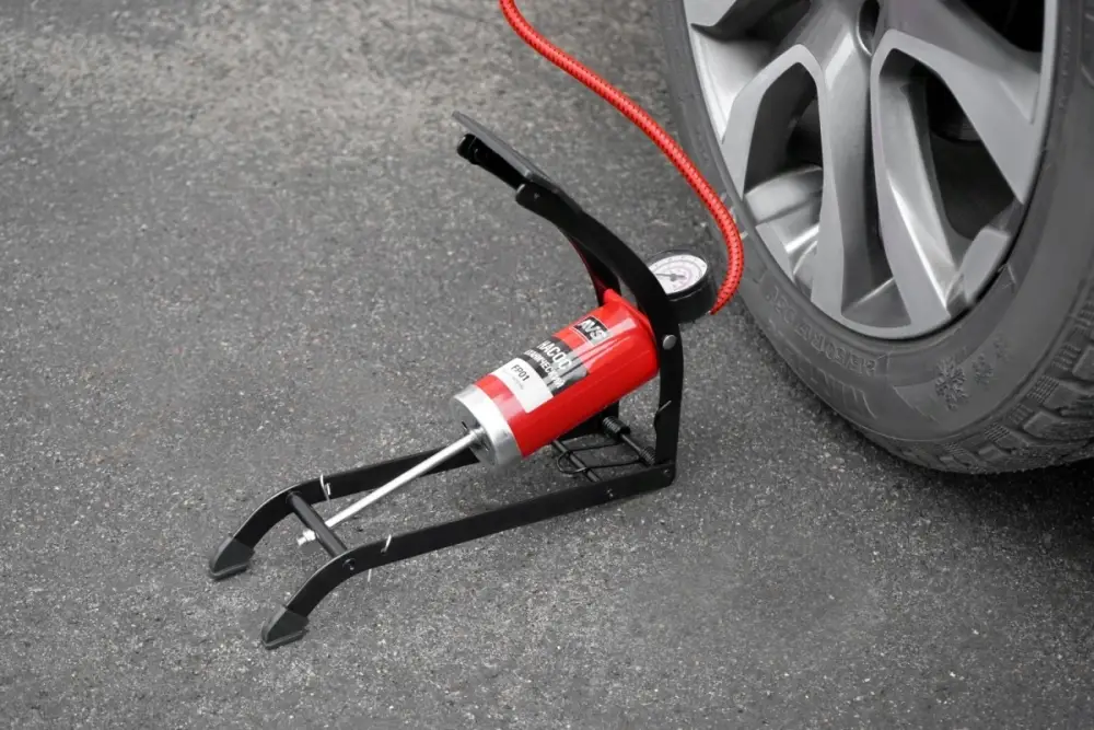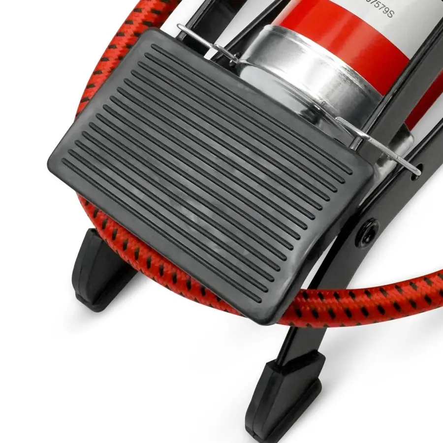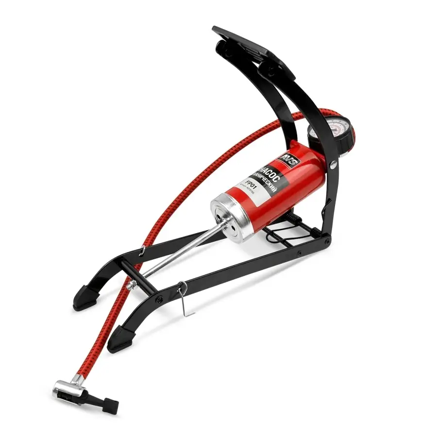 Насос состоит из опорной рамы, педали, поршня со штоком, цилиндра, возвратной пружины, манометра со шлангом и невозвратным клапаном.