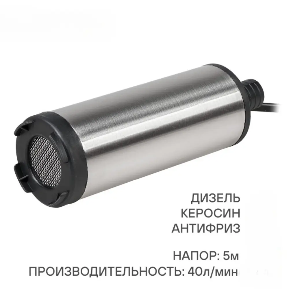 Погружной насос комплектуется выключателем, расположенным на проводе, зажимами типа «крокодил» и металлическим хомутом для обжима шланга. На дне насоса расположен фильтр грубой очистки из нержавеющей стали, благодаря нему в топливный бак автомобиля точно не попадут частицы мусора.