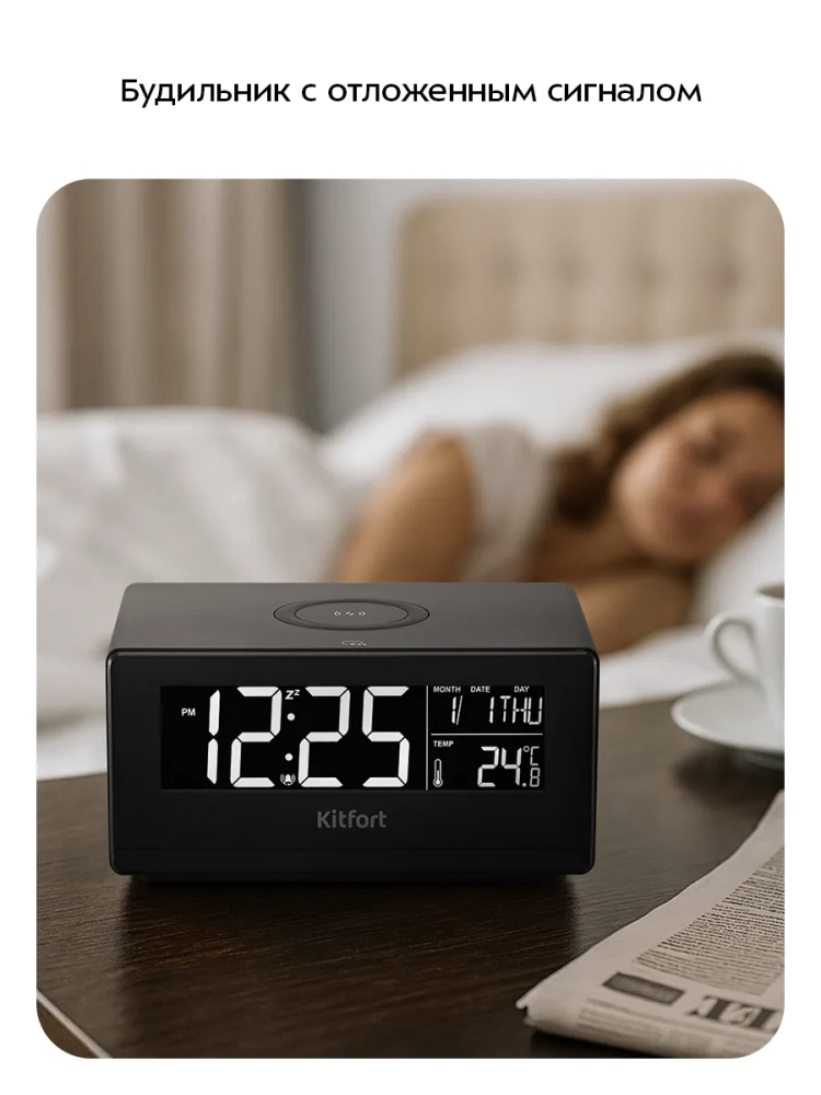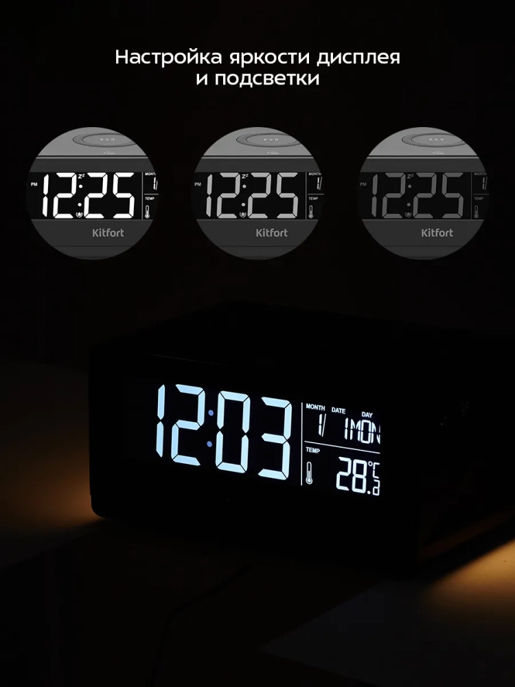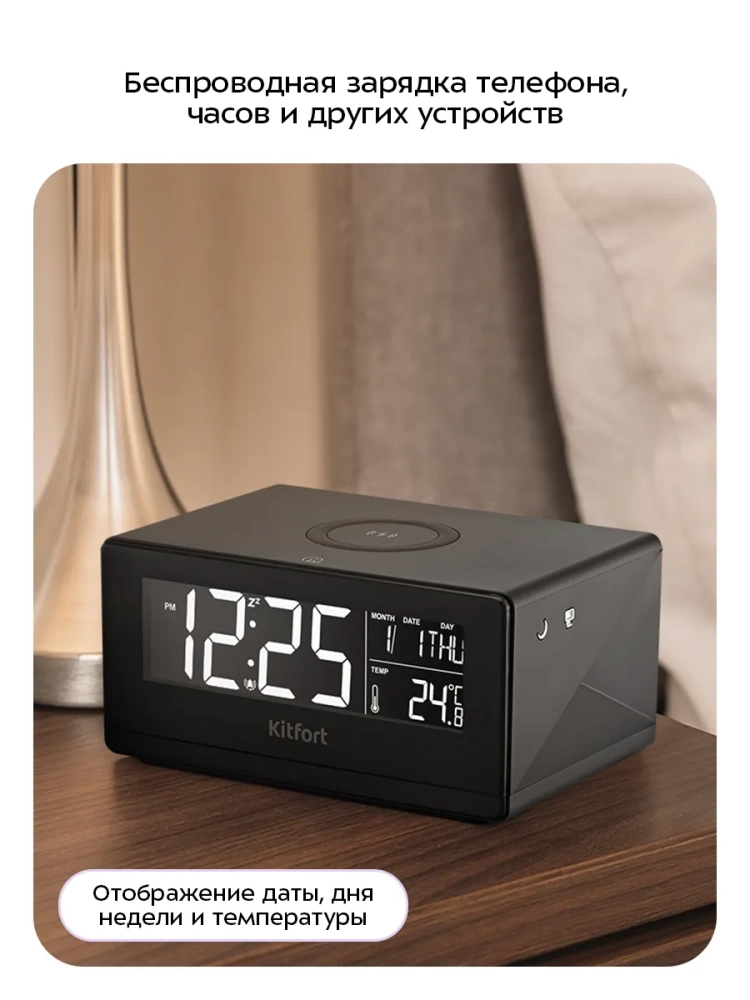 Настольные часы Kitfort KT-3390 выполняют сразу несколько функций: показывают время, дату, день недели и температуру в помещении, могут служить будильником и светильником. Благодаря беспроводной зарядке, встроенной в верхнюю часть корпуса, вы можете заряжать телефон, часы или другие устройства, если они поддерживают функцию беспроводной зарядки. Яркость дисплея и подсветки настраивается, что очень удобно. Также подсветку и дисплей можно отключить. Благодаря стильному дизайну и компактному размеру настольные часы легко впишутся в ваш интерьер.