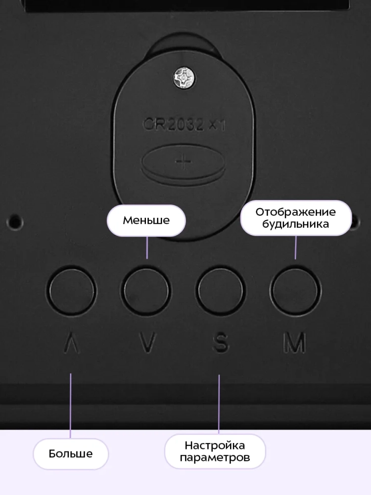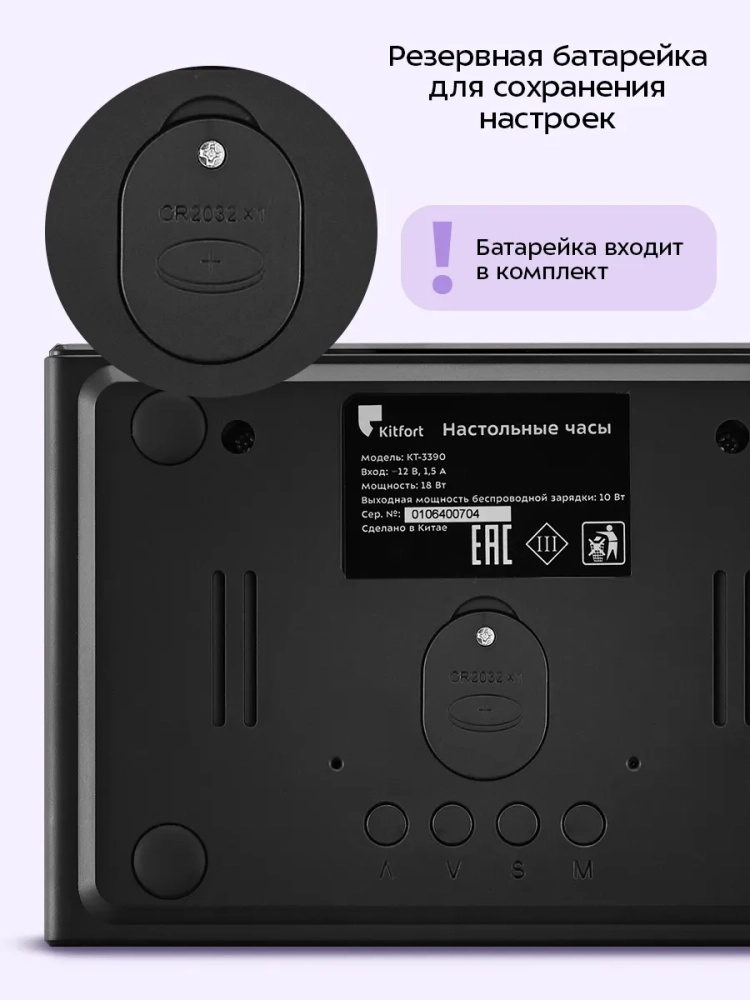 Внутри отсека для батареек установлена резервная батарейка типа CR2032, чтобы при отключении от источника питания настройки не сбивались. Резервная батарейка нужна только для сохранения настроек, настольные часы не будут работать без подключения к источнику питания.