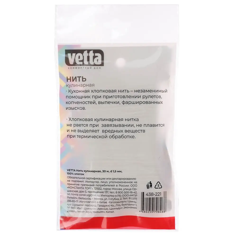 Хлопковая кулинарная нить VETTA длиной 30 м и диаметром 1,5 мм применяется для приготовления мясных рулетов, при копчении, запекании, для связки ног и крыльев куриц. Не токсична, поэтому безопасна для здоровья. Не врезается в мясо, за счет чего отличается практичностью. Нить прочно держит узел, благодаря чему сохраняет форму продукта.