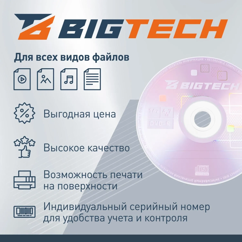 Носители информации Bigtech YDVDRP001 DVD-R 4,7Гб Printable 16x 100/уп cake