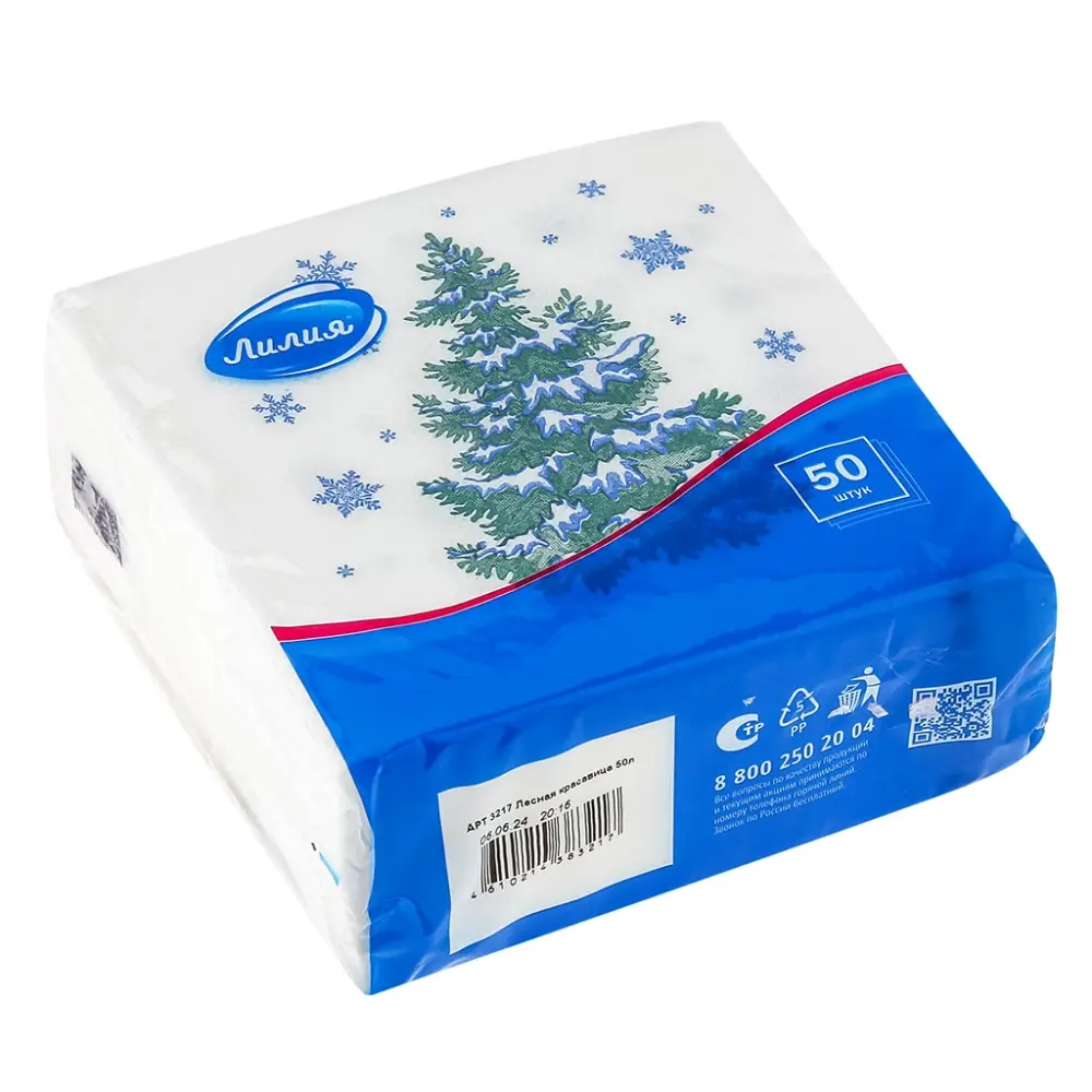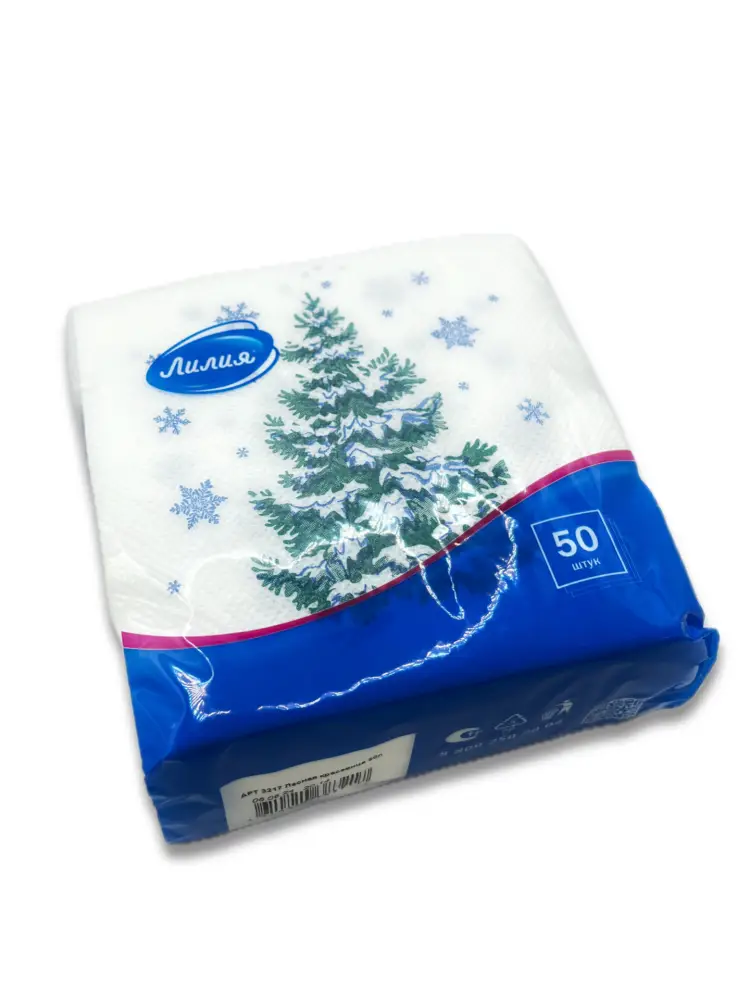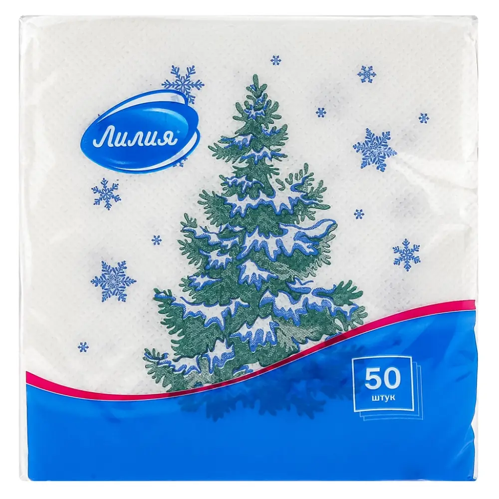 Салфетки бумажные новогодние Лилия "Лесная красавица". Однослойные. Размер: 24 х 24. В 1 упаковке – 50 штук. Производитель: Россия.