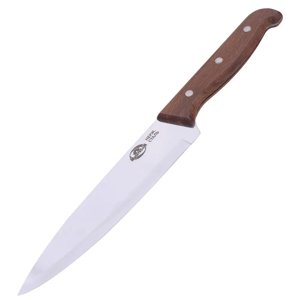 Нож для нарезки мяса, рыбы, фруктов и овощей станет универсальным помощником на кухне. Используйте нож для приготовления мясных и овощных блюд, салатов, супов и закусок. Острое и прочное лезвие рассчитано на длительную эксплуатацию, обеспечит комфорт во время использования. Изготовлен: лезвие из коррозионностойкой (нержавеющей) стали, ручка из дерева. Общая длина 28 см, длина лезвия 16,5 см.