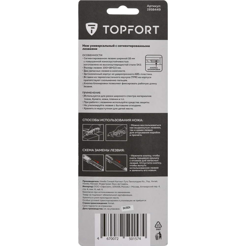 Нож универсальный мультифункц. Topfort 18мм блок.сист.,ABS+TPR,2 зап.лезв