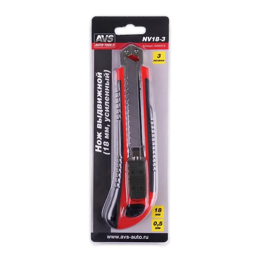Нож выдвижной 18 мм (метал. направляющая, обрезин. корпус, 3 лезвия в комплекте) AVS NV18-3