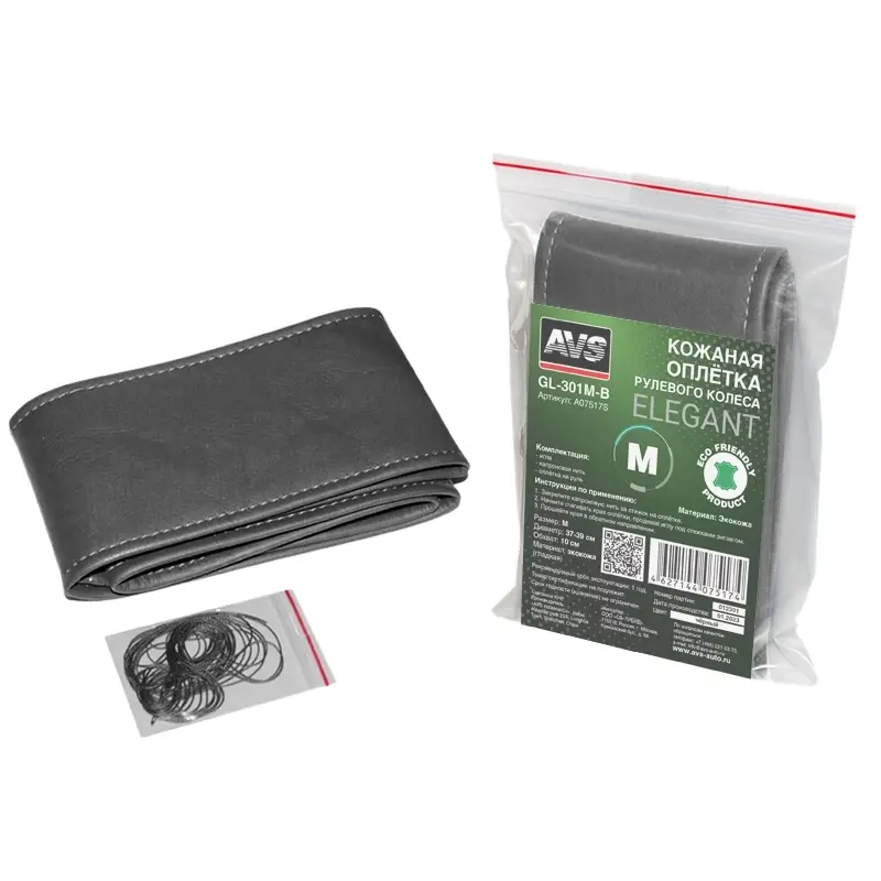 Оплетка на руль (эко-кожа) AVS GL-301M-B (размер M, черный) со шнурком (гладкая) - Серия "Elegant"