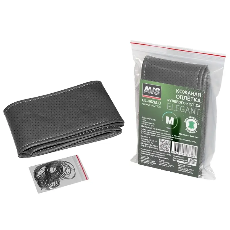 Оплетка на руль (эко-кожа) AVS GL-302M-B (размер M, черный) со шнурком (перфорированная) - Серия "El