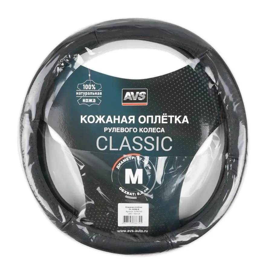 Оплетка на руль (нат. кожа) AVS GL-920M-B (размер M, черный) - Серия "Classic"