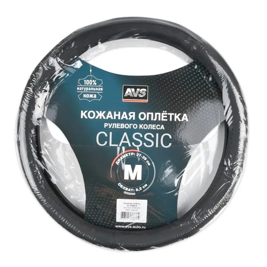 Оплетка на руль (нат. кожа) AVS GL-930M-B (размер M, черный) - Серия "Classic"