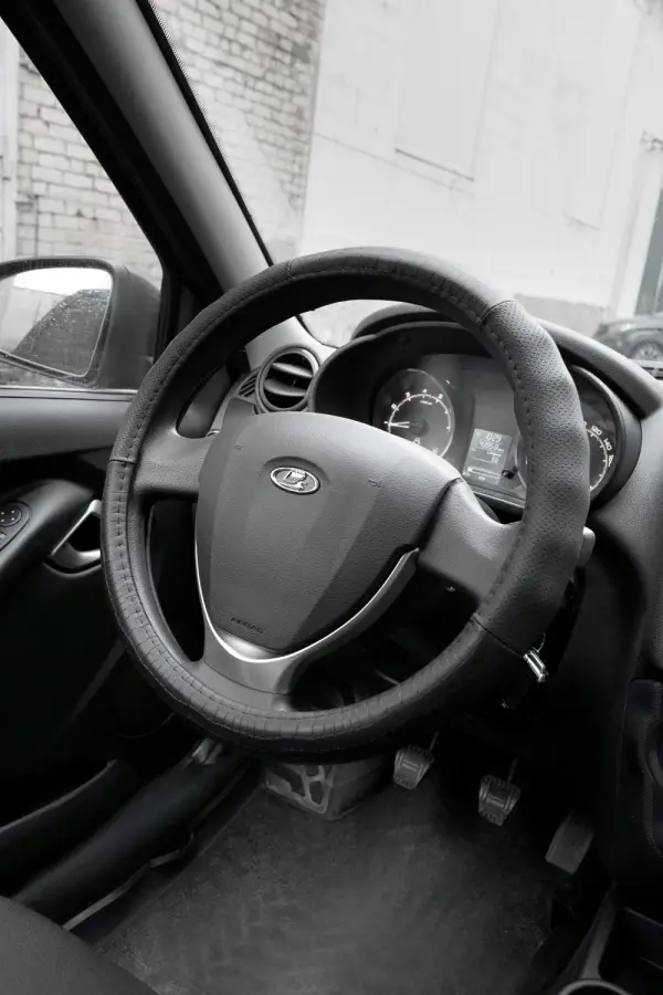 Оплетка из натуральной кожи с волнообразной формой обода. В местах хвата расположены вставки из перфорированной кожи и углублениями под пальцы, что способствует удобному хвату руля при маневренном вождении.