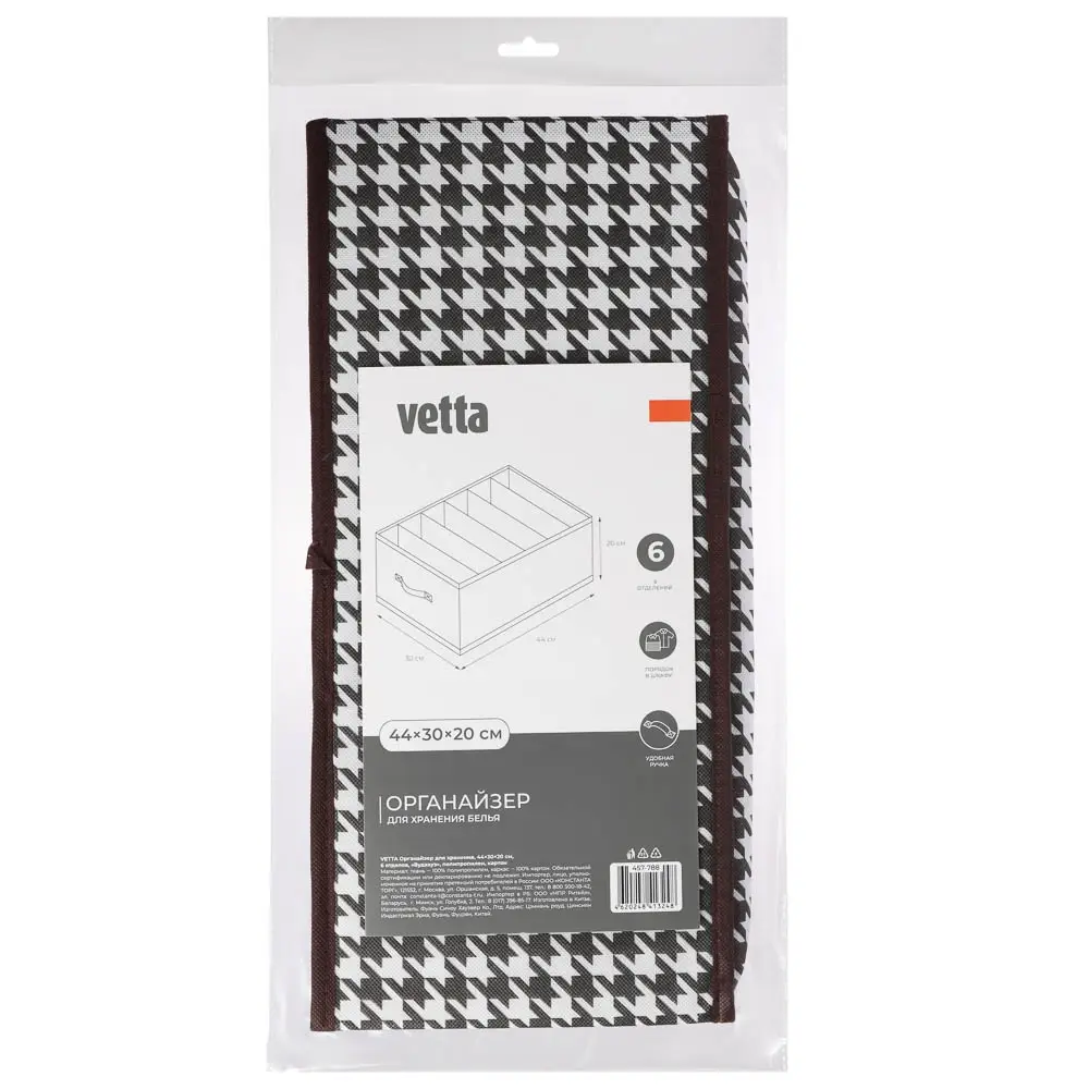VETTA Органайзер для хранения — это универсальный помощник в организации пространства и поддержании порядка в вашем доме. Благодаря своим размерам 44х30х20 см и шести отделениям, он идеально подходит для хранения различных предметов, таких как одежда, обувь, аксессуары и многое другое. Изготовленный из полипропилена и картона, этот органайзер обладает высокой прочностью и долговечностью, обеспечивая надёжное хранение ваших вещей. Чёрно-белый дизайн с рисунком «гусиная лапка» придаёт изделию стильный и современный вид, который легко впишется в любой интерьер.