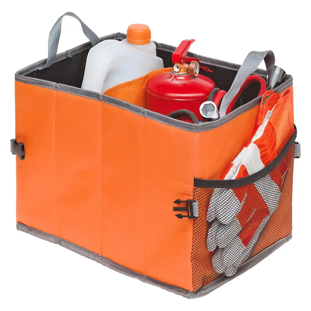 Благодаря своей конструкции может складываться гармошкой и не занимать много места.Органайзер имеет два отсека и наружный карман, позволяющие разместить в нем все необходимые автомобилисту инструменты и аксессуары. Имеет удобные ручки для транспортировки. При компактных размеров не займет много места в багажнике автомобиля.Наличие липучки на нижней и наружной части органайзера препятствует скольжению сумки по салону автомобиля.