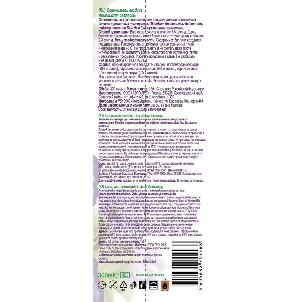 Освежитель воздуха First Fresh Альпийская свежесть 300 мл КзнЧлСпб