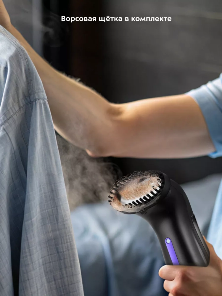 В комплекте к отпаривателю поставляются мерный стакан для удобного добавления воды и ворсовая насадка, которая позволяет почистить вещь от пыли, волос или шерсти при отпаривании.