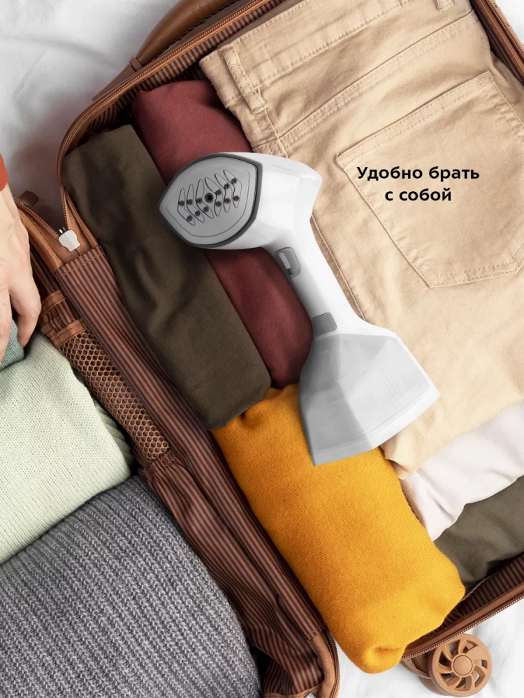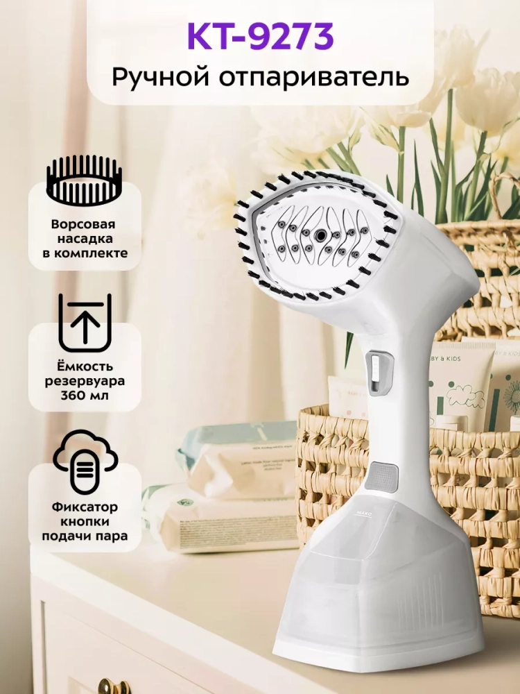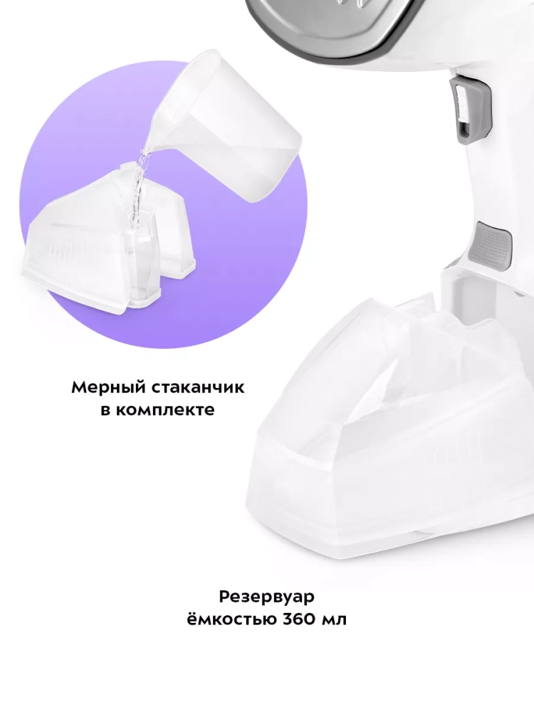 Ручной дизайн отпаривателя позволяет легко маневрировать и обрабатывать одежду в труднодоступных местах. Вертикальная конструкция с вешалкой обеспечивает удобство в использовании, позволяя отпаривать одежду прямо на вешалке, что особенно полезно для деликатных тканей. В комплекте с отпаривателем идет мерный стаканчик для точного дозирования воды, что упрощает процесс подготовки устройства к работе.