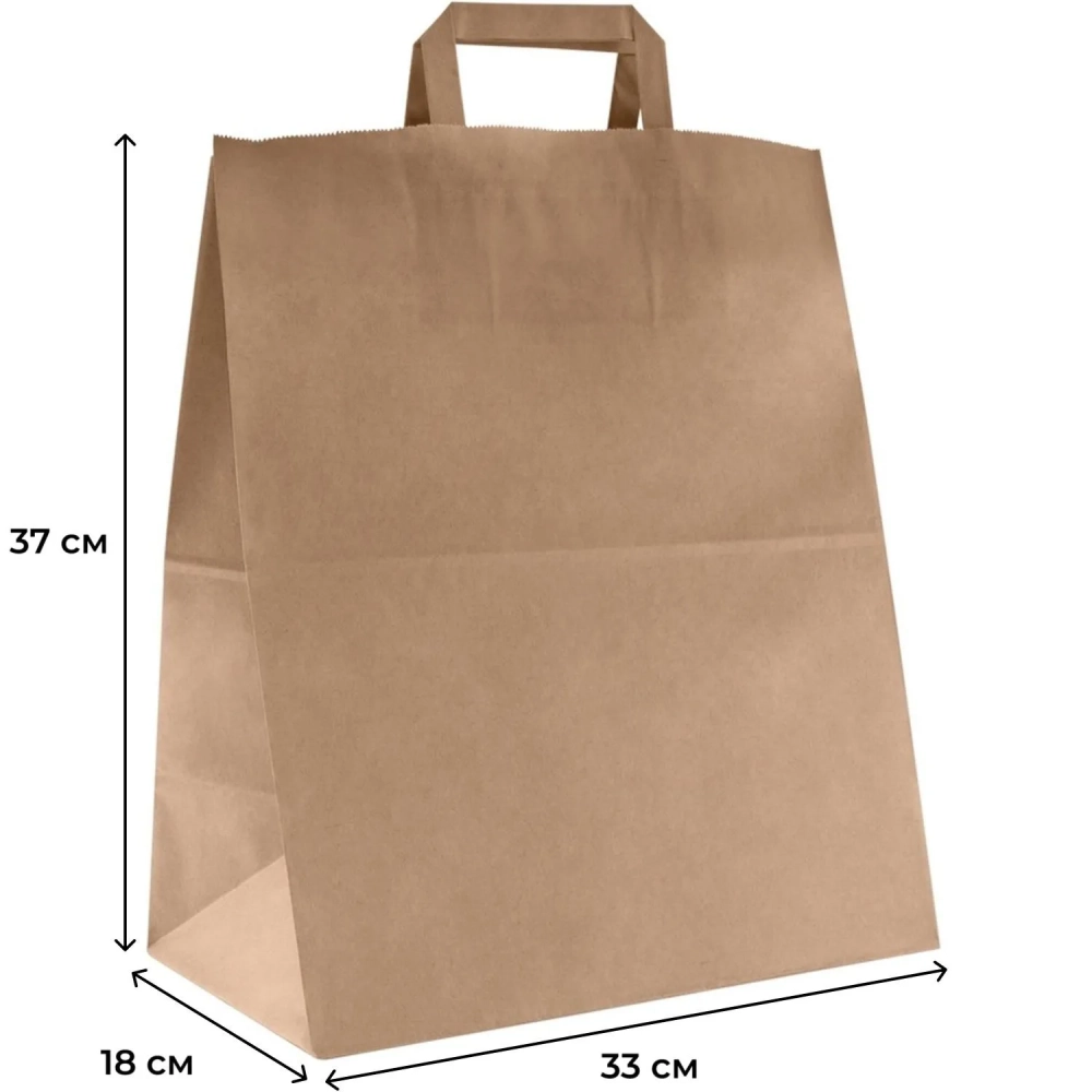 Пакет бумажный 330х180х370 мм с плоскими ручками, крафт 80 гр, 200 шт/уп
