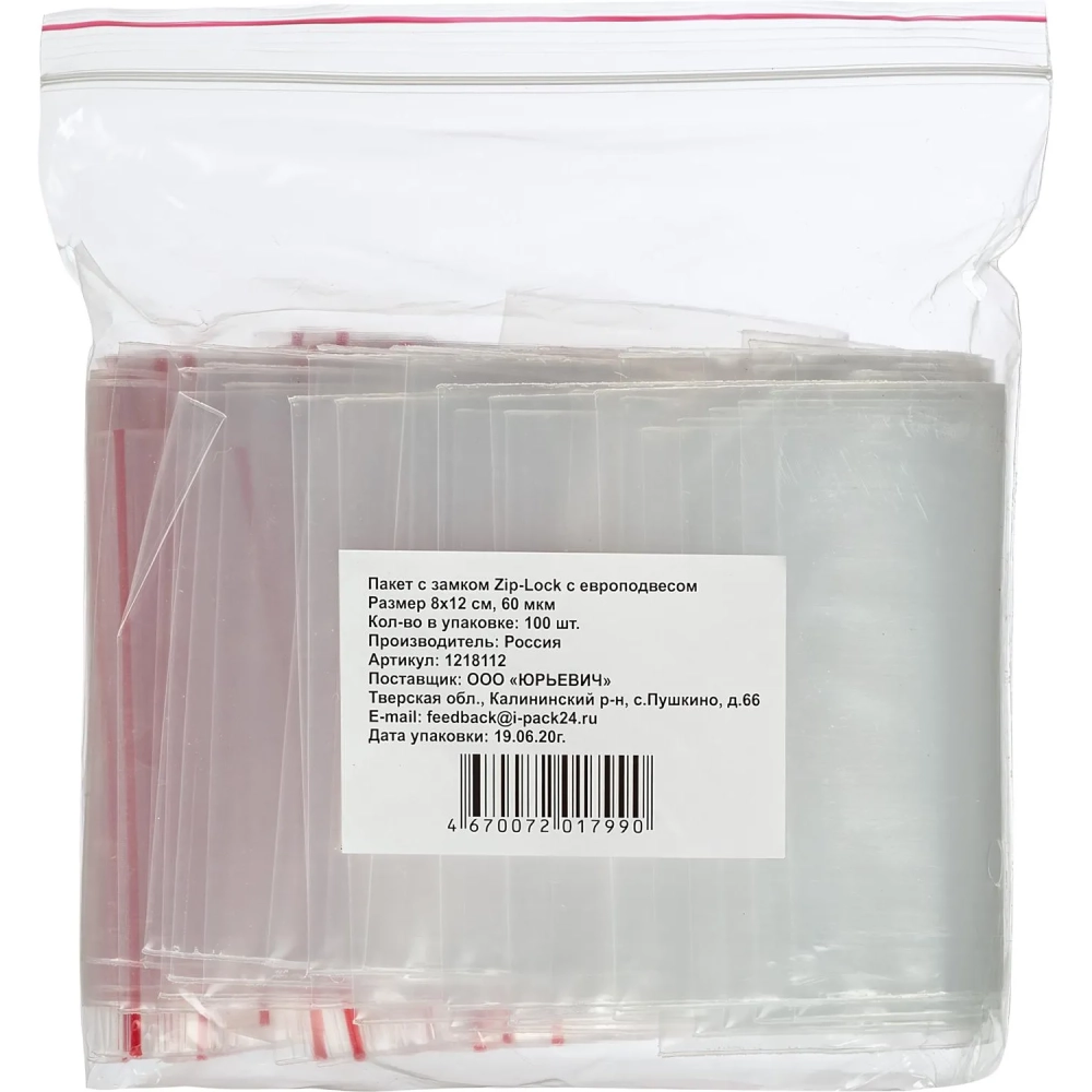 Пакет с замком (Zip Lock) с европодвесом 8 х 12 см, 60 мкм, 100 шт/уп