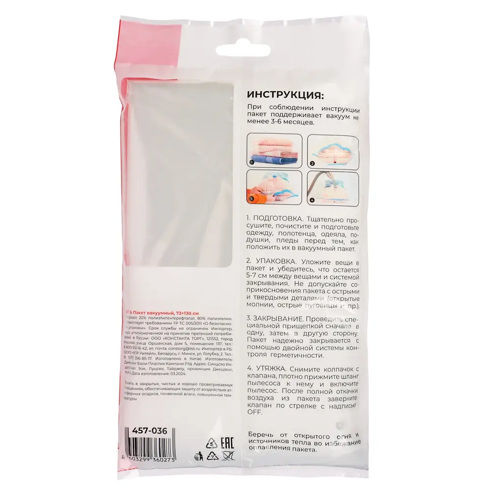 Подушки, одеяла, зимняя одежда, мягкие игрушки занимают много пространства в Вашем шкафу? Вакуумные пакеты с клапаном 73х130 см на 70% уменьшают пространство за счет откачки воздуха. Просто поместите вещи в пакет, закройте его с помощью застежки zip-lock, присоедините шланг пылесоса к клапану и откачайте воздух. Единожды использовав такой вид хранения вещей Вы не только сами будете его применять, но и рекомендуете своим друзьям.