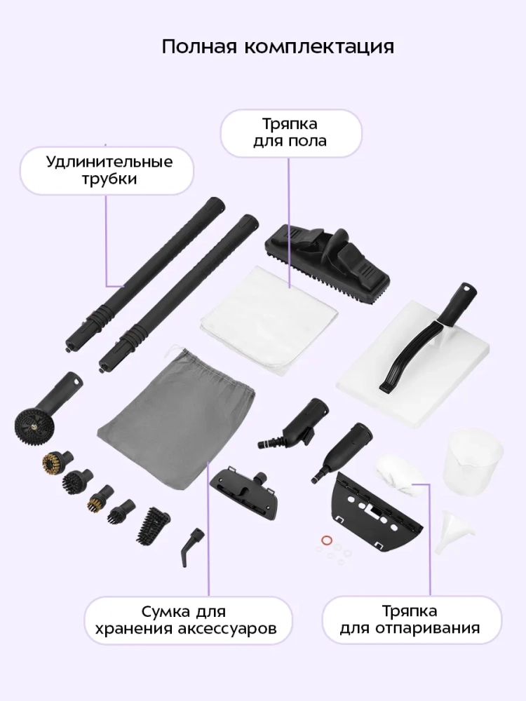 Большое кол-во насадок в комплекте поможет очистить труднодоступные или сильнозагрязненные поверхности. Чтобы аксессуары не потерялись, в комплекте есть сумка, куда их удобно убрать на хранение.