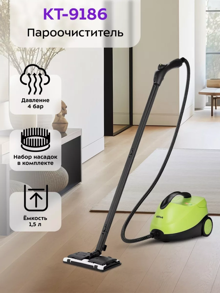 Пароочиститель Kitfort КТ-9186 предназначен для уборки полов и поверхностей, находящихся как внутри, так и вне помещений.