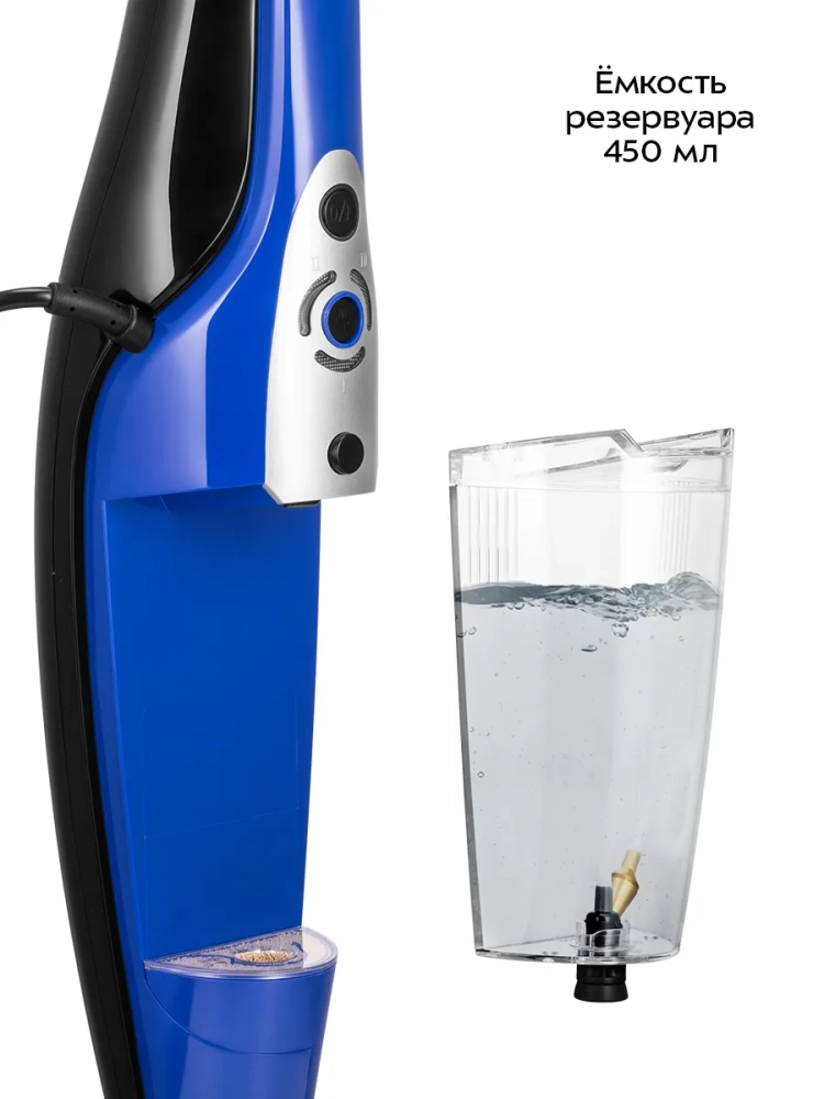 Устройство оснащено съемным резервуаром для воды емкостью 450 мл, что позволяет производить непрерывную уборку до 10 минут.