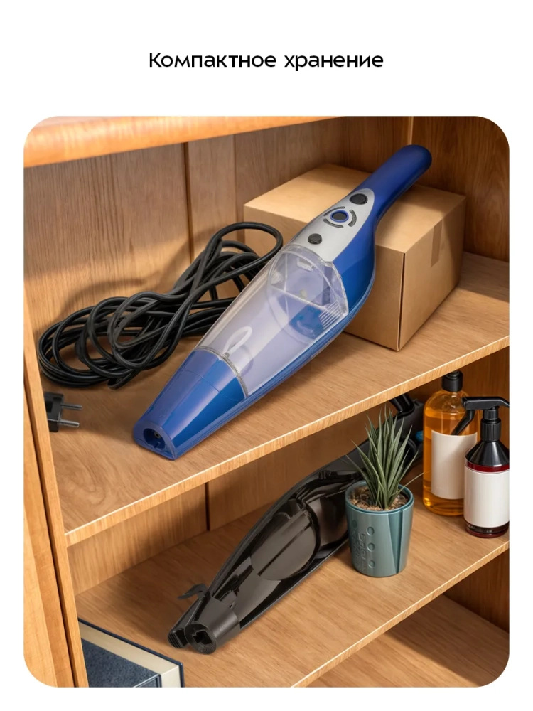 В устройстве предусмотрены держатели для шнура. Удлинительная ручка складная, что обеспечивает компактное хранение.