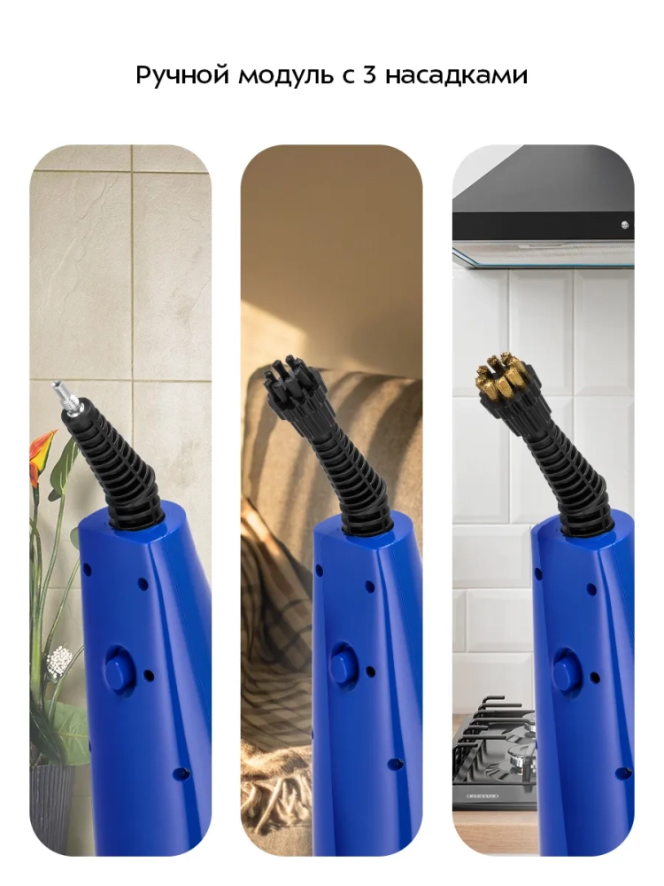 Кнопка подачи пара позволяет выбирать один из трех уровней выходящего пара. Это очень удобно при очистке разных типов поверхностей с разным уровнем загрязнения.