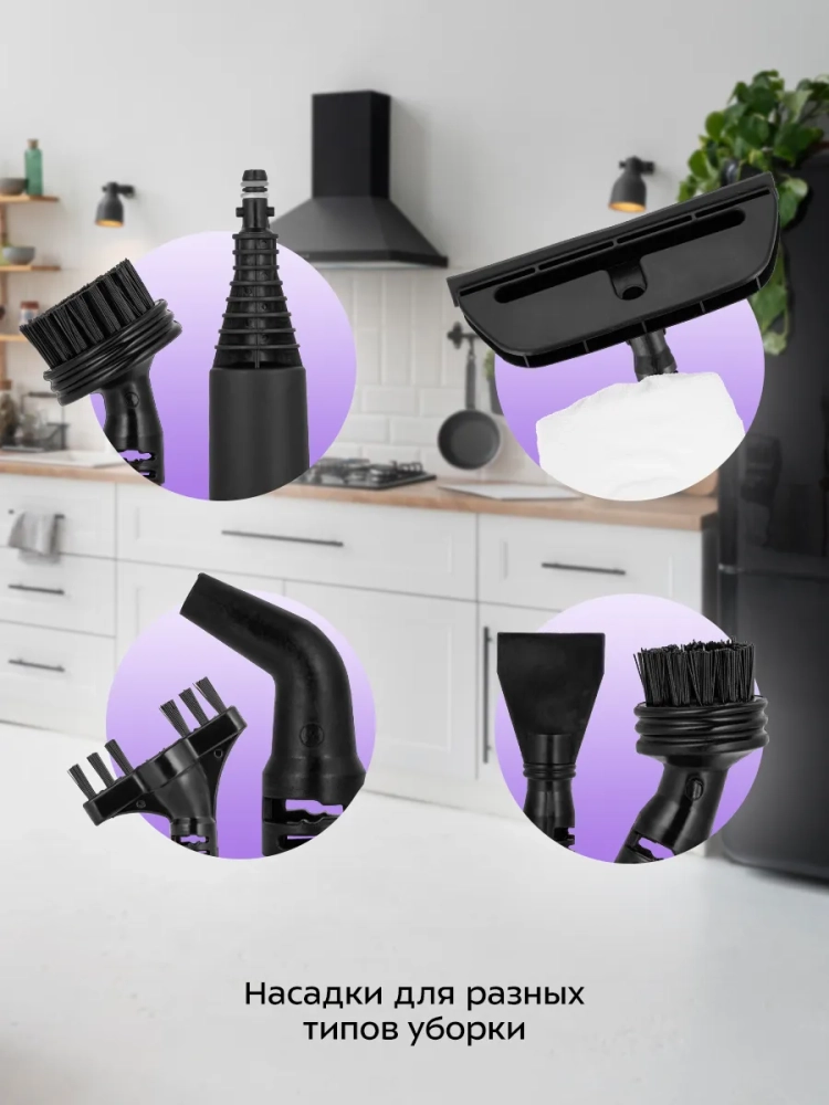 Если отсоединить ручку и щетку, то паровая швабра превращается в ручной пароочиститель. Им можно чистить паром различные поверхности и предметы: кафель и швы между плитками, сантехнику для кухни и ванны, духовки, плиты, СВЧ печи, жировые и известковые отложения. Для усиления механического воздействия в комплекте идут нейлоновые щетки и скребок.