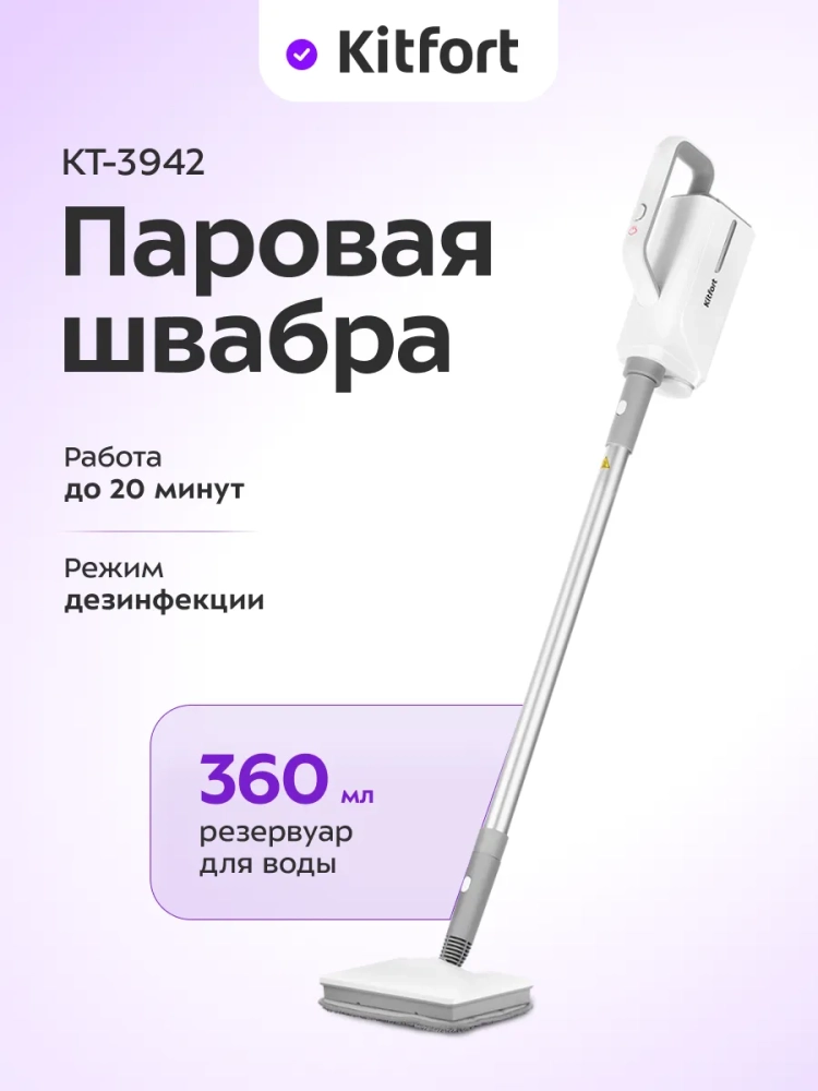 Паровая швабра Kitfort КТ-3942 — универсальное устройство, которое поможет избавиться от пыли и грязи с помощью мощной струи пара, а также продезинфицирует обрабатываемую поверхность. При помощи парового шланга и специальных насадок из комплекта КТ-3942 очистит не только напольные покрытия, но и раковину и плиту на кухне, зеркала, окна и плитку в ванной без каких-либо химических средств — исключительно паром.