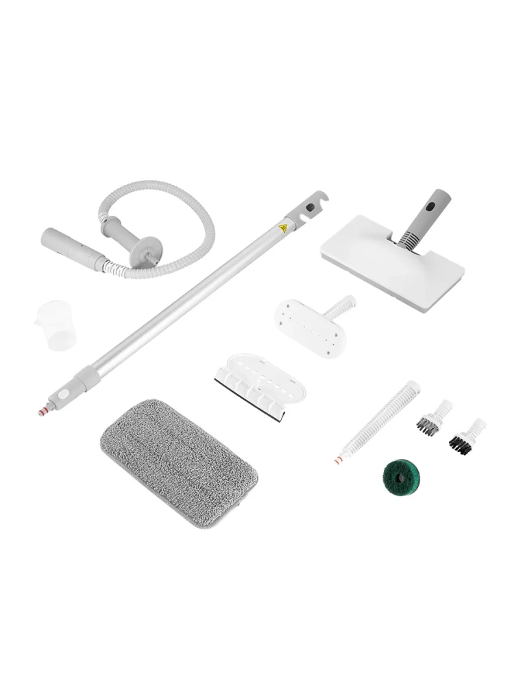 Конструкция «2 в 1» предусматривает использование ручного модуля паровой швабры с насадками без присоединения к нему удлинительной трубки. Струйная насадка используется для очистки щелей и углов. Стальная и нейлоновая щетки, а также щетка-скраб эффективно очищают сложные загрязнения с помощью механического воздействия. Для отпаривания одежды и чистки обивки мягкой мебели используется насадка для отпаривания. Для очистки окон, зеркал и кафельной плитки на насадку для отпаривания устанавливается насадка с резиновым скребком. Благодаря паровому шлангу вы сможете провести очистку труднодоступных мест. С помощью мерного стакана из комплекта удобно заполнять резервуар для воды.