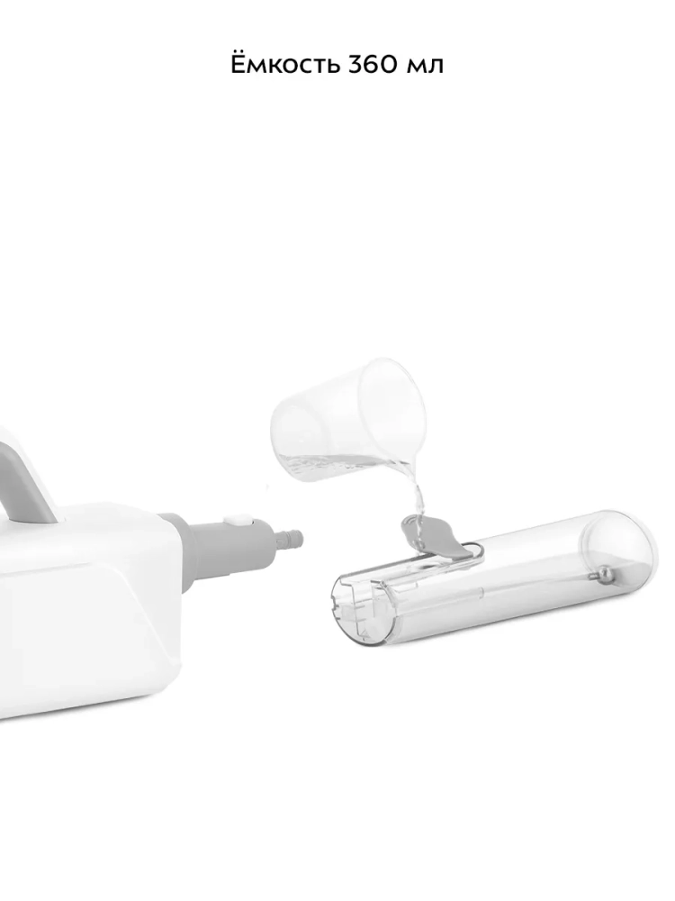 Устройство оснащено съемным резервуаром для воды емкостью 360 мл, что позволяет производить непрерывную уборку до 15–20 минут в зависимости от интенсивности выходящего пара.