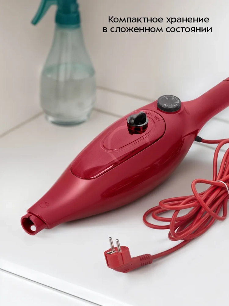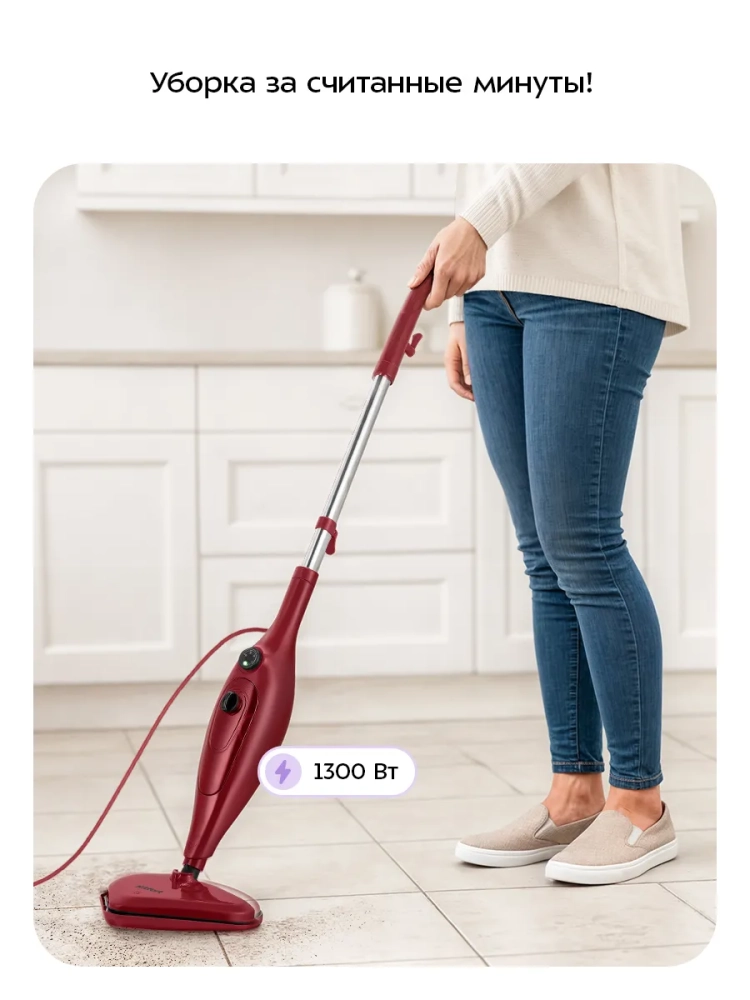 Пар проникает внутрь загрязнения, размягчая и растворяя его, а затем с помощью тряпки частички грязи смываются. Для паровой швабры не нужны чистящие средства, поэтому она станет идеальным решением для аллергиков. В комплекте есть рамка для ковра, которая обеспечивает легкое скольжение напольной насадки по ковру.