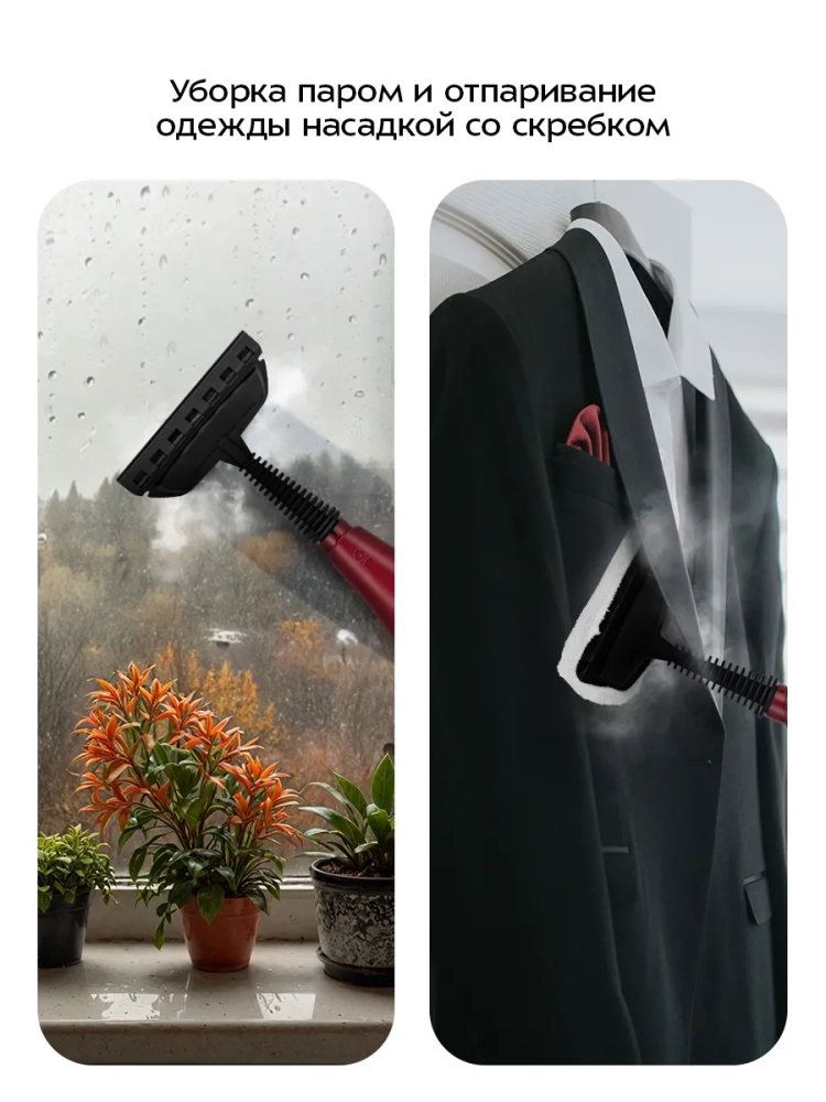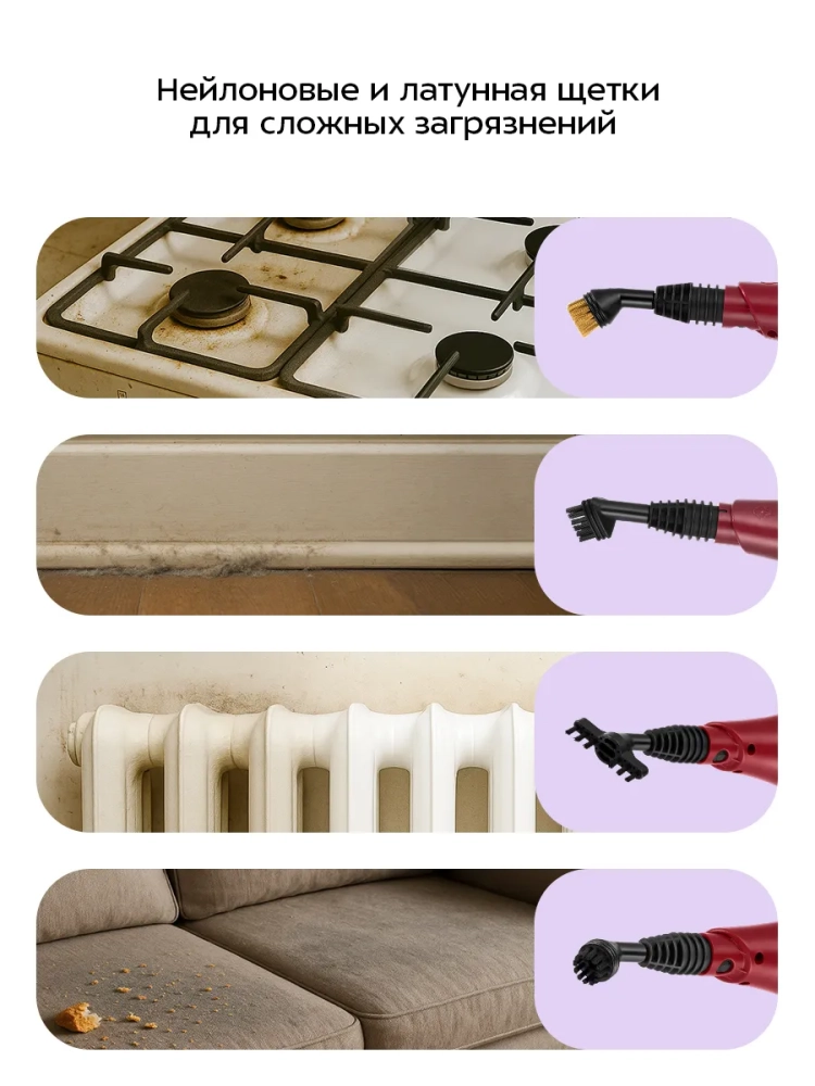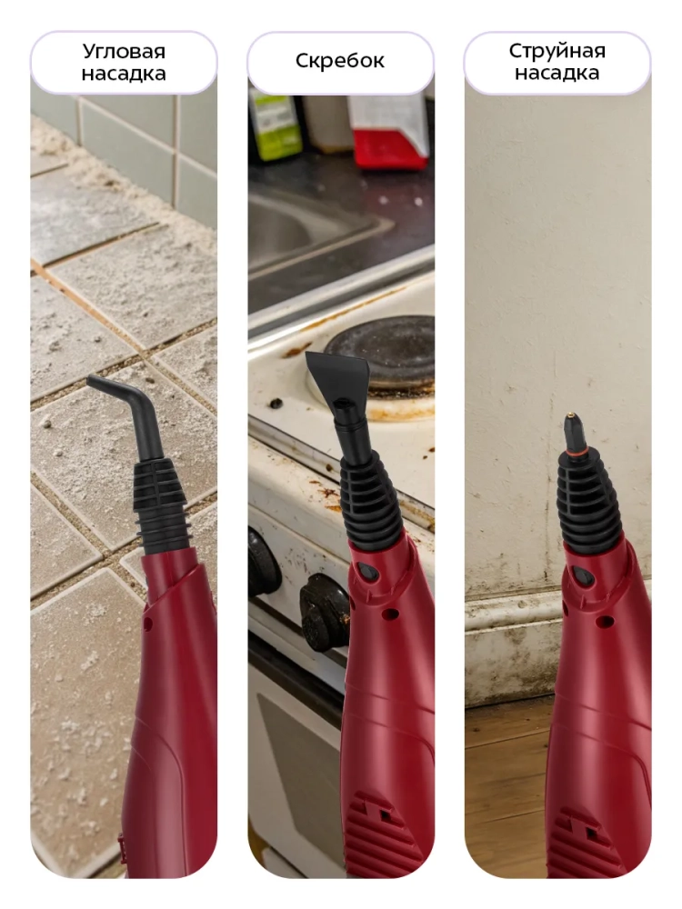 Конструкция «2 в 1» предусматривает использование ручного модуля паровой швабры с насадками без присоединения к нему удлинительной ручки. Большое количество насадок в комплекте поможет очистить труднодоступные или сильнозагрязненные поверхности. Струйная и угловая насадки используются для очистки щелей и углов. Скребок, латунная и нейлоновая щетки эффективно очищают сложные загрязнения с помощью механического воздействия. Для очистки окон, зеркал и кафельной плитки предусмотрена насадка со скребком. Вы можете надеть на насадку со скребком тряпку с ворсом для сбора сгоняемой скребком воды и впитывания загрязнений. Если на насадку со скребком установить тряпку для отпаривания, насадка может использоваться для отпаривания одежды и чистки обивки мягкой мебели. С помощью мерного стакана из комплекта удобно заполнять резервуар для воды. Спица для чистки предназначена для удаления загрязнений в паровом сопле ручного модуля и насадок.